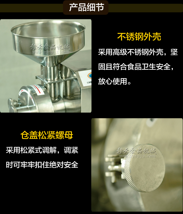 贛云不銹鋼磨粉機有1100型、2200型和3000型三種型號,這款是3000型不銹鋼磨粉機,造型外觀和2200型相同,采用干濕磨盤以及全不銹鋼構(gòu)架,外形美觀大方,亮光,不銹鋼色澤清洗,采用3kw大功率純銅電機帶動磨盤轉(zhuǎn)動,磨粉細度可調(diào),適合磨不同粗細的五谷,米漿等。