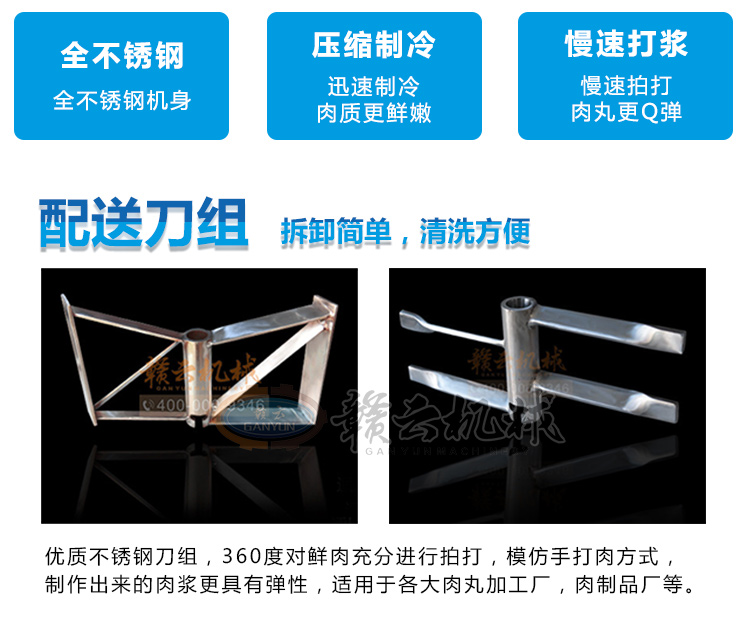 贛云牌36型壓縮機制冷式慢速肉丸打漿機,采用先進的壓縮制冷系統(tǒng),對打漿外桶進行制冷,有效確保肉類制品在打漿過程肉類品質,防止升溫改變?nèi)赓|,整機采用皮帶輪減速,通過慢速刀旋轉拍打肉粒魚糜等并調配成有一定粘稠度的漿狀物料,便于成型機成型,其拍打過程中能對肉類組織細胞拉絲重組,加大吸收水分,提高肉類的嫩化程度,打出來的漿類制成肉丸魚丸等,彈、脆、有嚼勁,產(chǎn)品一經(jīng)推出,深受肉制品加工客戶青睞。
