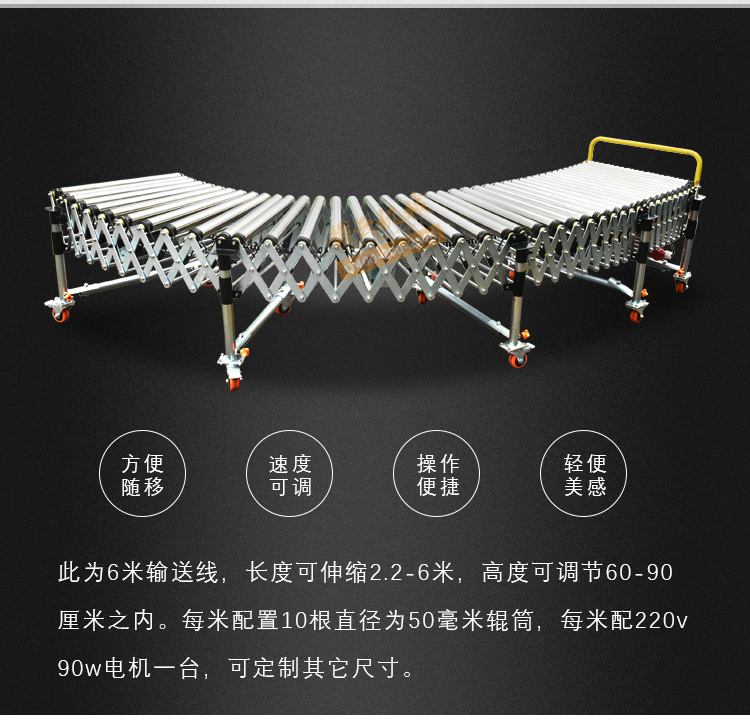 此為6米輸送線,長度可伸縮2.2-6米,高度可調(diào)節(jié)60-90 厘米之內(nèi)。每米配置10根直徑為50毫米輥筒,每米配220v 90w電機一臺,可定制其它尺寸。