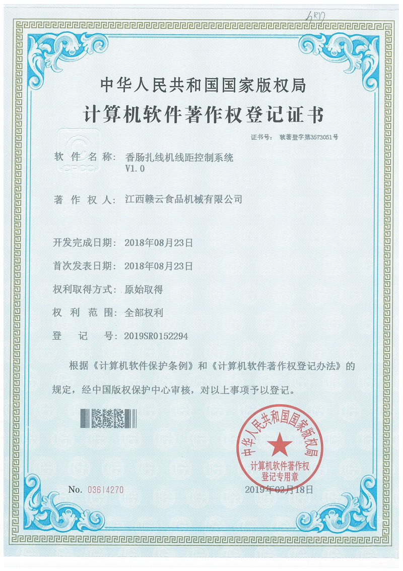 計算機軟件著作權(quán)登記證書(香腸扎線機線距控制系統(tǒng))