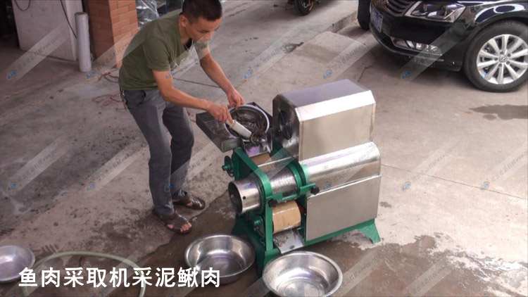 魚(yú)肉采取機(jī)又稱魚(yú)肉分離機(jī)和魚(yú)骨分離機(jī),可采取魚(yú)肉、蝦肉、泥鰍肉,本次試機(jī)演示了魚(yú)肉采取機(jī)采泥鰍肉的過(guò)程。