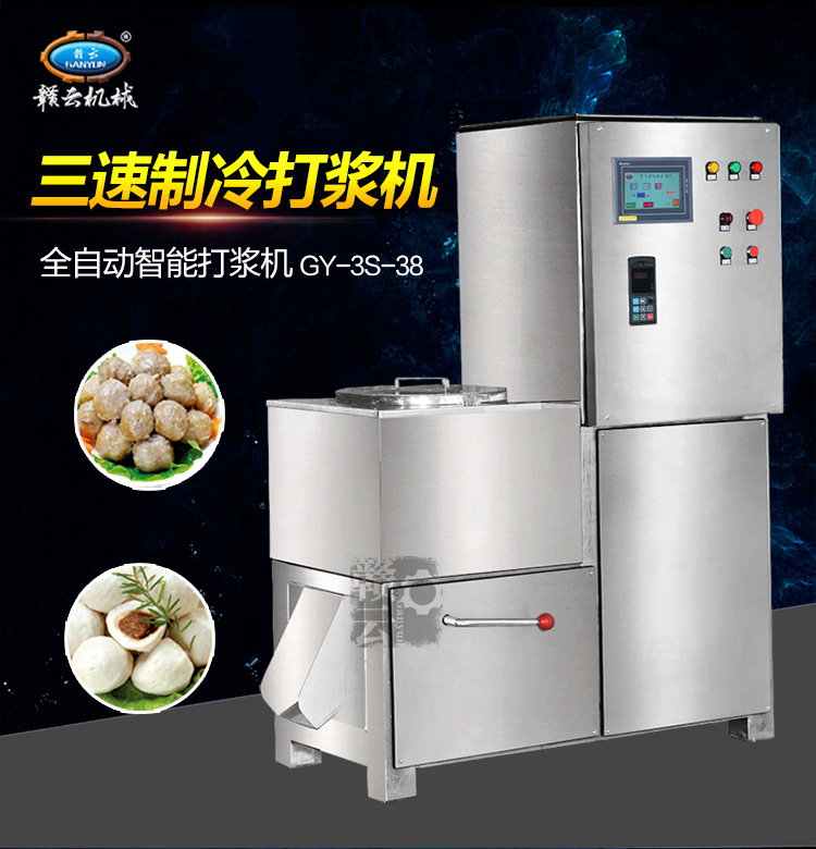 贛云2016推出38型新款三速制冷打漿機,集低、中、高三種速度合一,配備對應的三種刀組,結合高效的壓縮制冷系統、程序觸摸操控系統、打漿桶溫控感應報警停機系統,獨家設計閥門流水式出料,專為中小型肉丸加工廠和大型肉丸廠實驗室打漿設備量身打造之用。適合各式肉丸制漿,是未來全能智能打漿典型代表作品。