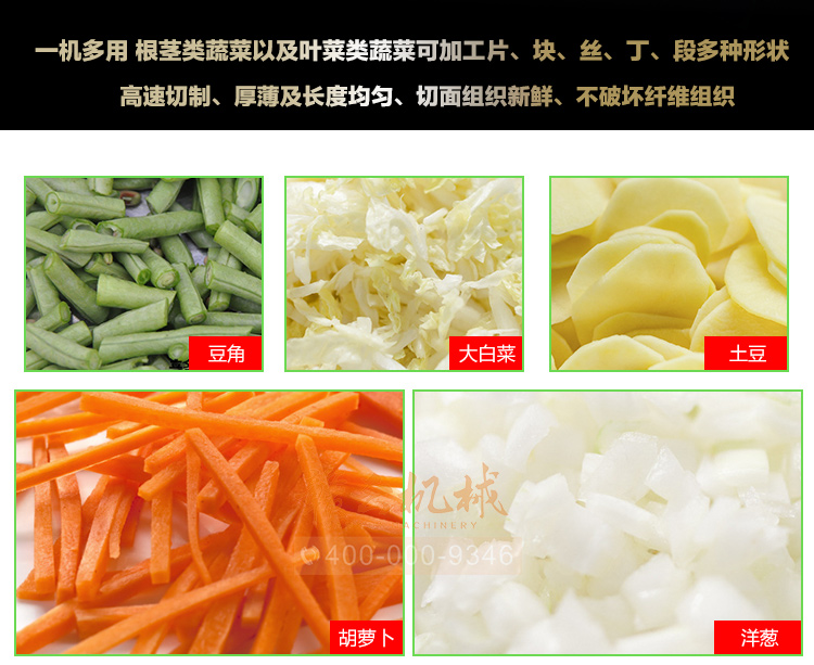 雙機頭切菜,切菜長度規格可調,切菜速度和切刀速度變頻可調,適用于切割范圍0-60mm。適用于葉菜類、球根類果蔬的切割,雙機頭切菜,切菜長度規格可調,是我國常用的切菜刀具,如:蘿卜、土豆、青菜、紅薯等果蔬切片或切碎理想廚房設備。從此告別切菜煩惱,降低企業勞動成本,提高切菜效率和速度。