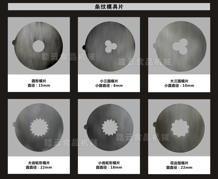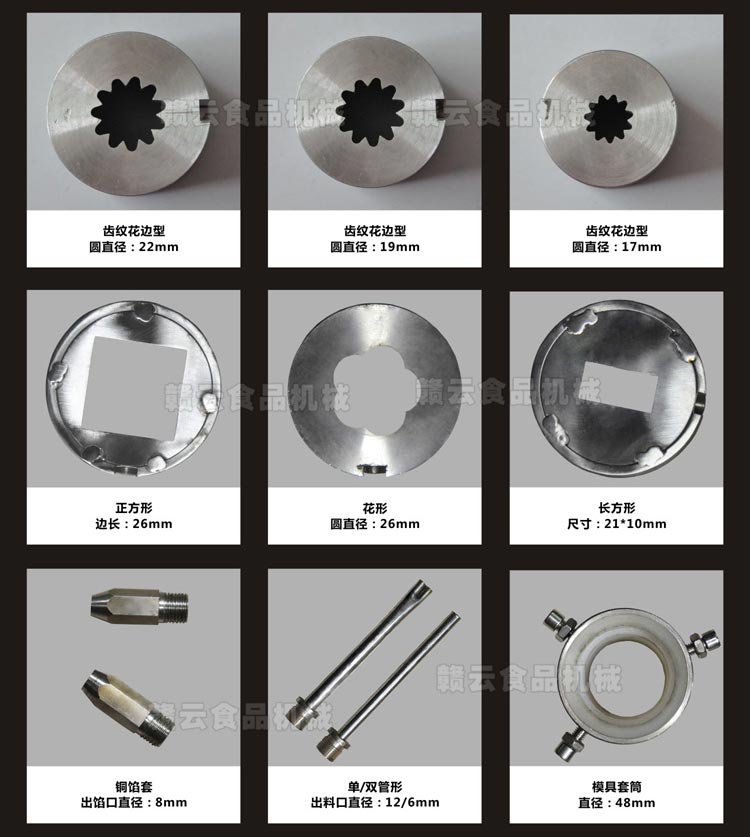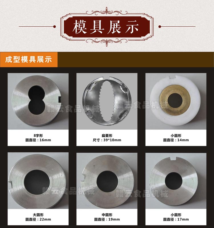 火鍋丸子成型機安裝不同形狀的模具,成型出不同的火鍋丸子。可成型丸子種類繁多,例如:夾心墨魚條、魚肉卷、魚豆腐、甜不辣、麻花卷、魚排、開口笑黃金包、蟹肉棒、各種實心包心丸子等。