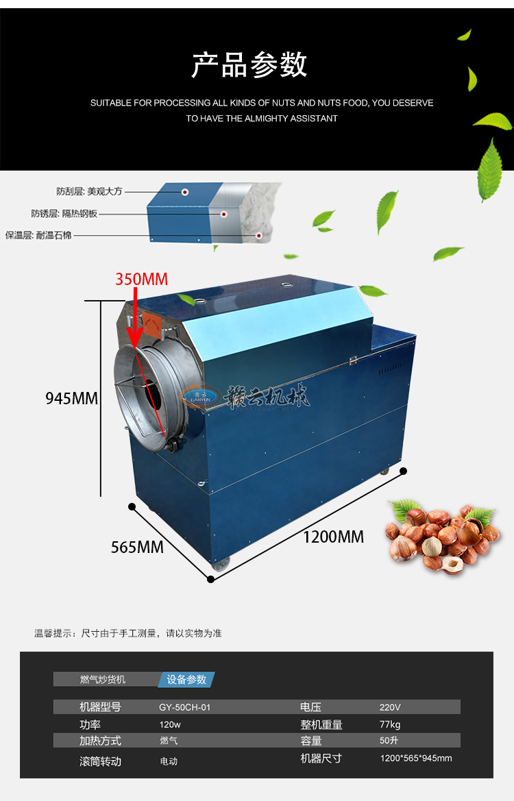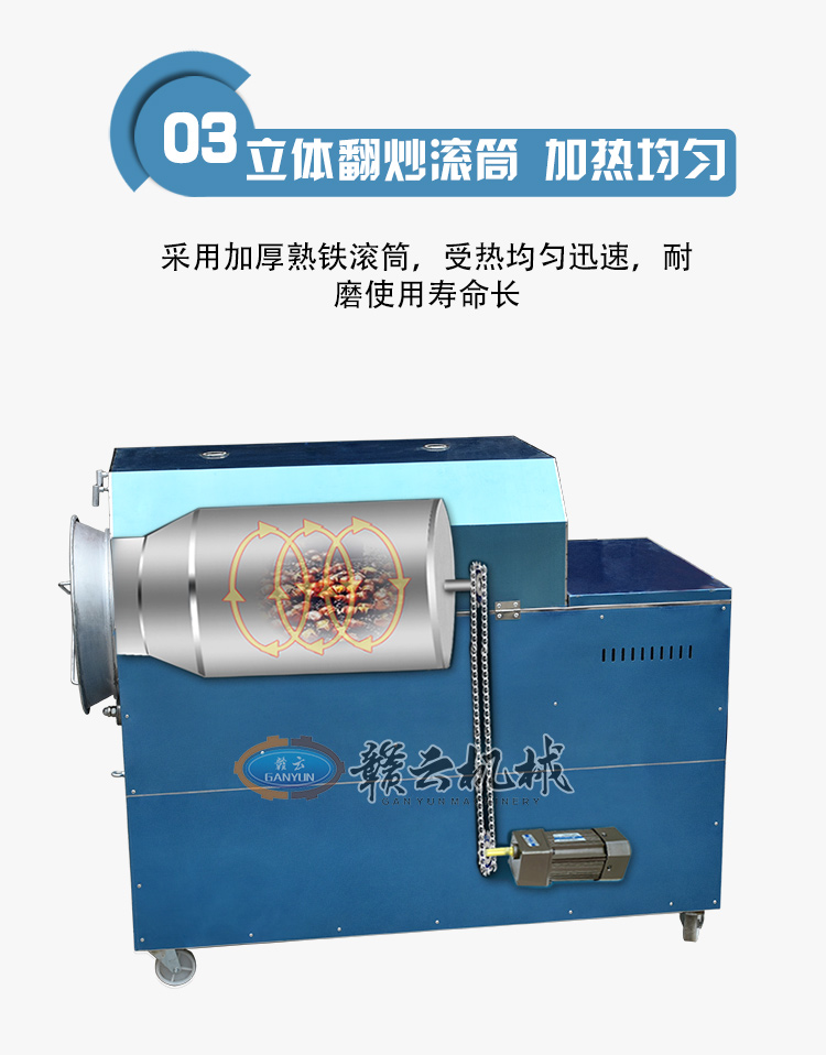 多功能炒貨機集各種大中小型炒貨機的優(yōu)點為一體,可使用液化氣或燃煤作為加熱源,自動旋轉(zhuǎn)、自動翻炒、自動出鍋,整機采用優(yōu)質(zhì)不銹鋼板加工成形,外觀豪華氣派,美觀大方,清潔衛(wèi)生,機器采用了先進的滾筒臥式結(jié)構(gòu),滾筒加熱均勻,并有保溫功能 , 工作時滾筒不停地旋轉(zhuǎn),使炒貨食品上下、左右、前后、全方位立體翻炒,不會出現(xiàn)粘鍋現(xiàn)象,炒制出的食品色澤金紅亮麗,香氣撲鼻。