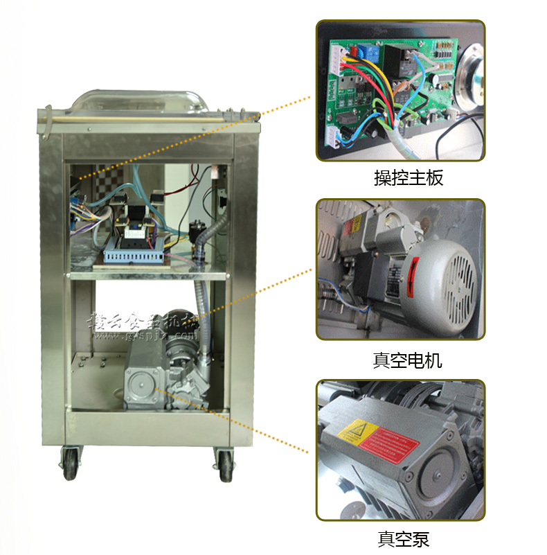 3、壓下真空蓋,面板上的抽氣指示燈亮,真空泵開始抽氣,機蓋即被自動吸引,抽真空時間可根據(jù)包裝要求調節(jié)適當時間。