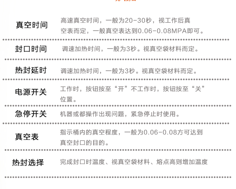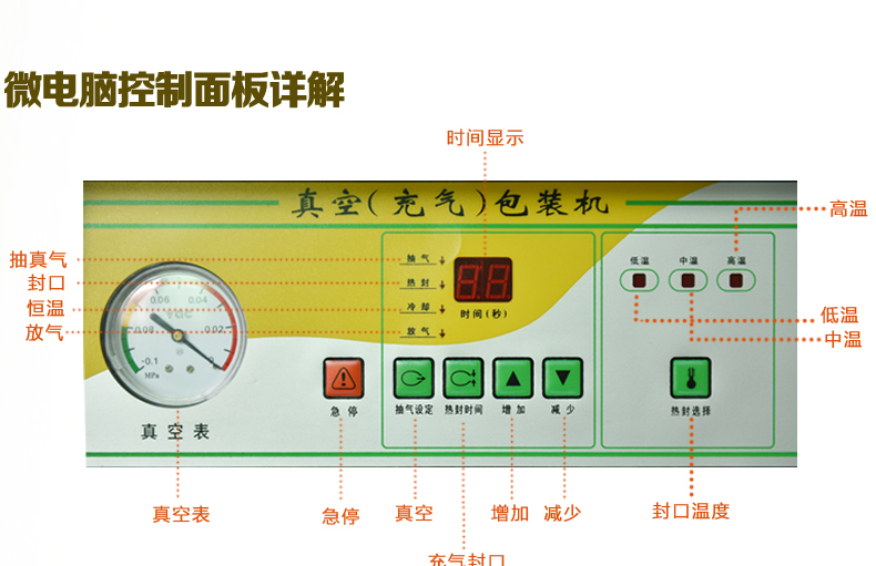 4、當(dāng)抽氣時(shí)間達(dá)到預(yù)設(shè)定時(shí)間時(shí),抽氣結(jié)束,指示燈隨之熄滅,熱封指示燈亮,此時(shí)電磁閥工作,進(jìn)入封口程序,面板上舍友熱封時(shí)間及溫度調(diào)節(jié)按鈕,以適應(yīng)不同厚薄的材料,調(diào)節(jié)時(shí)間及溫度應(yīng)注意一定根據(jù)所需的包裝袋規(guī)格來(lái)調(diào)整。