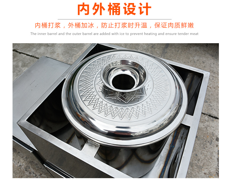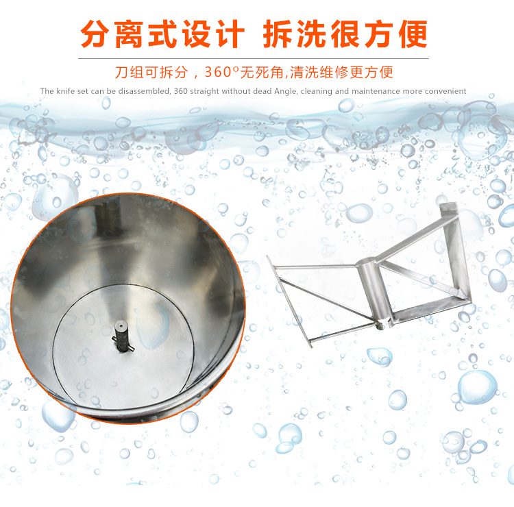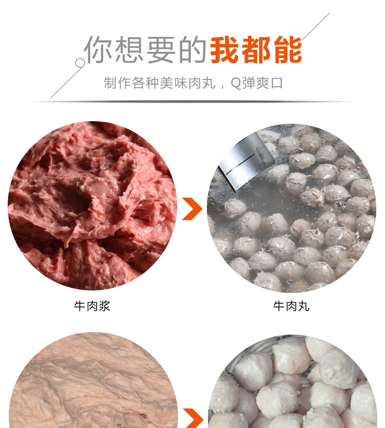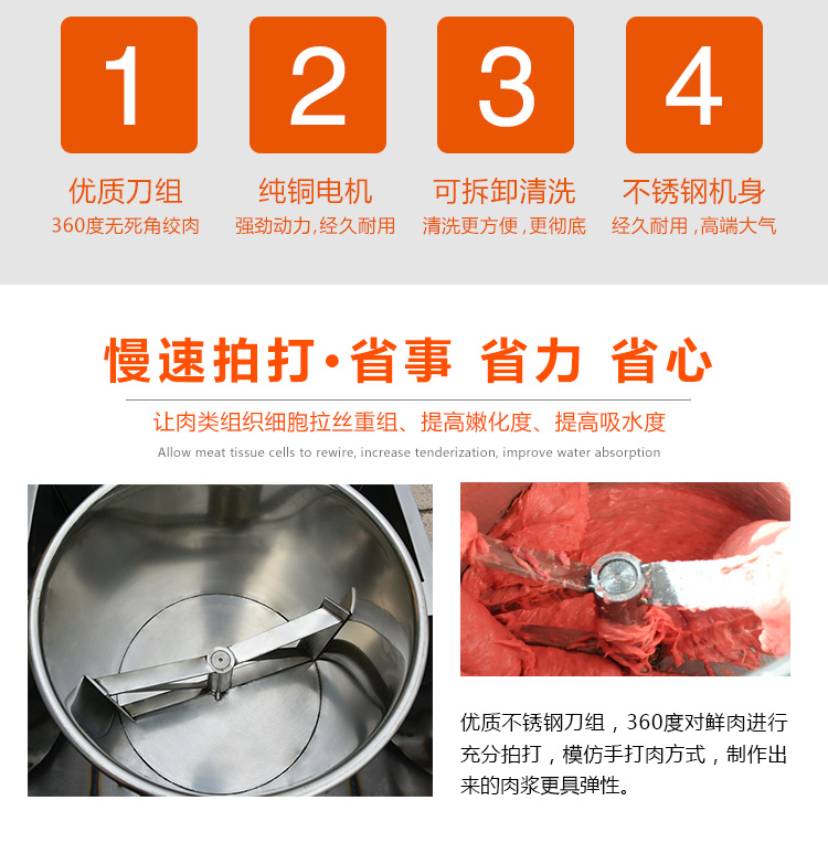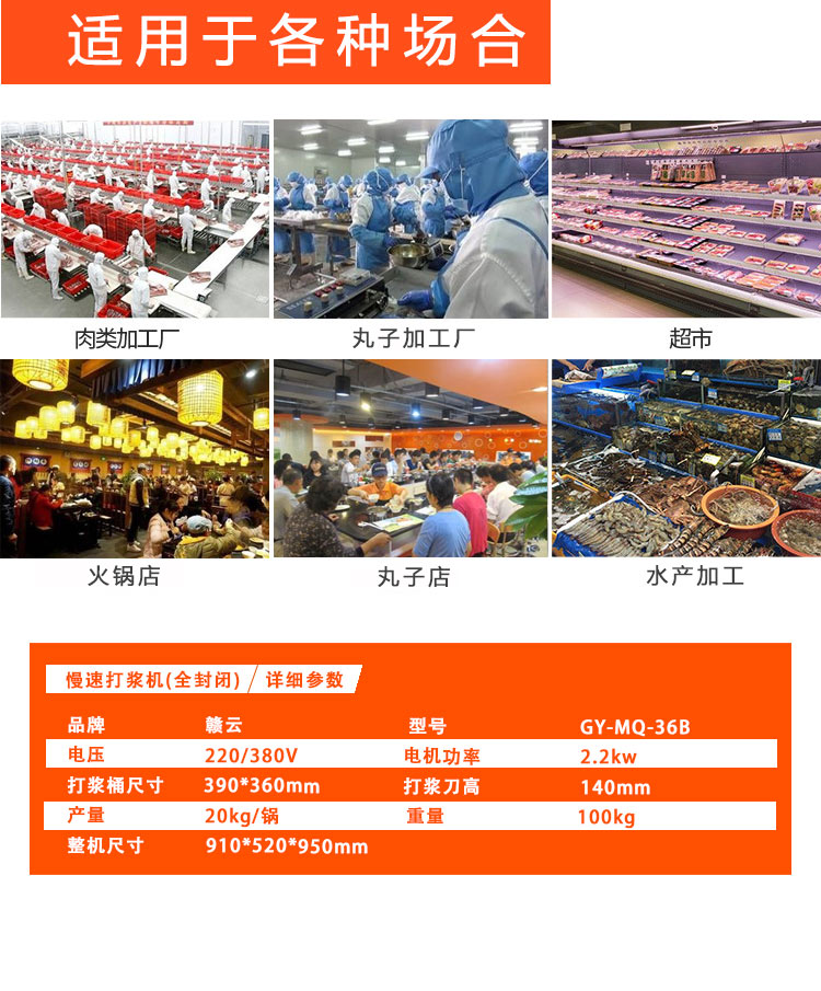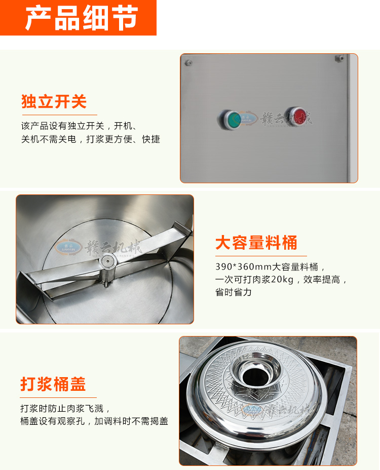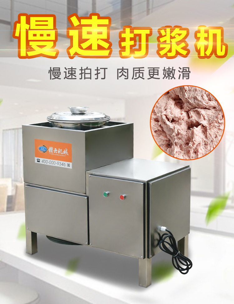 贛云牌36型全封閉式慢速肉丸打漿機選優(yōu)質(zhì)不銹鋼,在全不銹鋼慢速肉丸打漿機基礎(chǔ)上將整機外殼用不銹鋼板材封裝,更好的保護(hù)電動機,通過小皮帶輪帶動大皮帶輪減速,慢速拍打肉漿。
