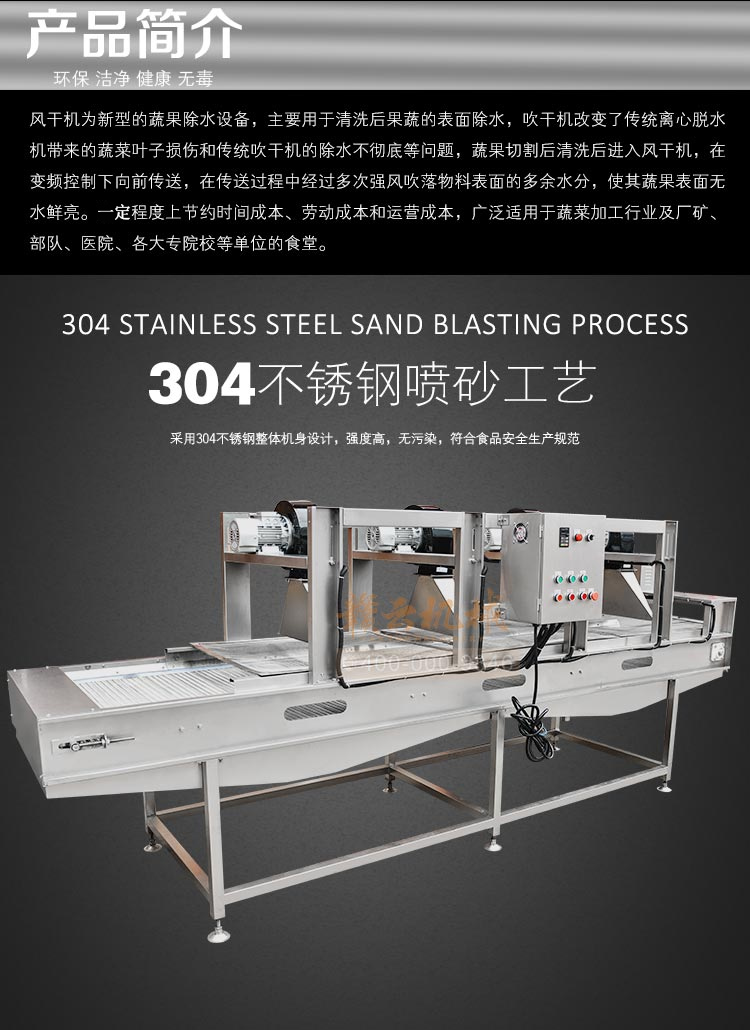 果蔬食品風(fēng)干機(jī),高效、快速、環(huán)保、安全、自動化。強(qiáng)風(fēng)去除表面水分+震動輸送。果蔬食品風(fēng)干機(jī)主要用于清洗后的果蔬去除表面水,震動吹干改變了傳統(tǒng)離心脫水機(jī)帶來的蔬菜也損傷和傳統(tǒng)風(fēng)干機(jī)除水不徹底等問題,蔬果切割后清洗后進(jìn)入震動風(fēng)干機(jī),在震動頻率下使物料向前傳送,在傳送過程中經(jīng)過多次強(qiáng)風(fēng)吹落物料表面的多余水分,使其蔬果表面無水鮮亮。最大程度上節(jié)約時(shí)間成本,勞動成本和運(yùn)營成本,廣泛適用于蔬菜加工行業(yè)及廠礦、部隊(duì)、醫(yī)院、各大院校等單位食堂。