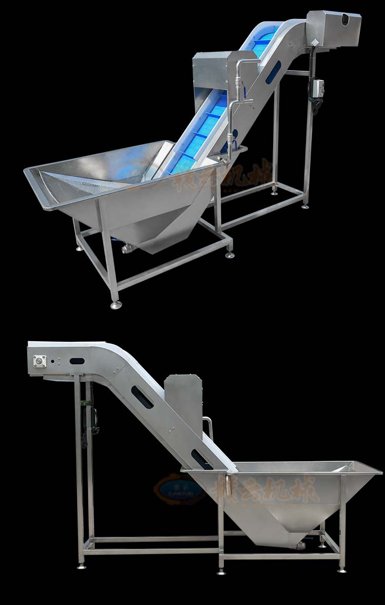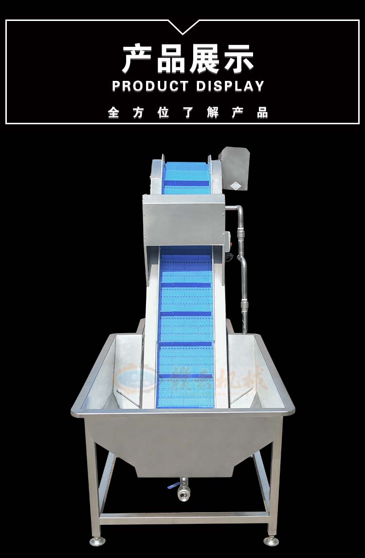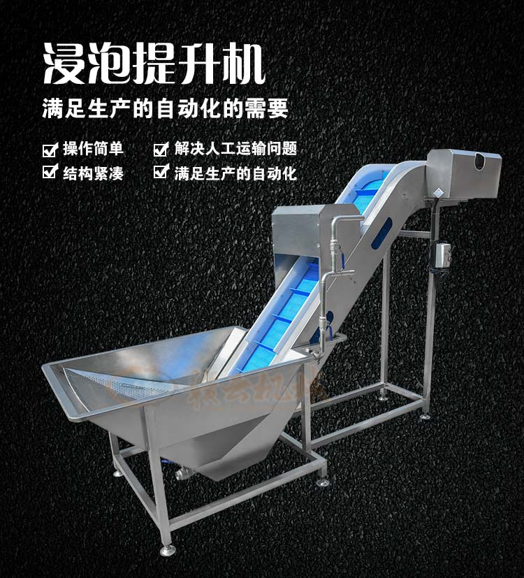 本機(jī)主要起提升和輸送的作用,浸泡清洗機(jī)是由水箱和提升機(jī)組合而成的機(jī)械,物料先倒入水槽后浸泡,在由提升機(jī)進(jìn)行提升給下一道工序。解決人工入料困難的問題;在流水生產(chǎn)線中,該設(shè)備通常和其他入料口要求高的設(shè)備搭配使用,滿足生產(chǎn)的自動化的需要。該機(jī)具有操作簡便、結(jié)構(gòu)緊湊、造型美觀、維修方便等優(yōu)點。