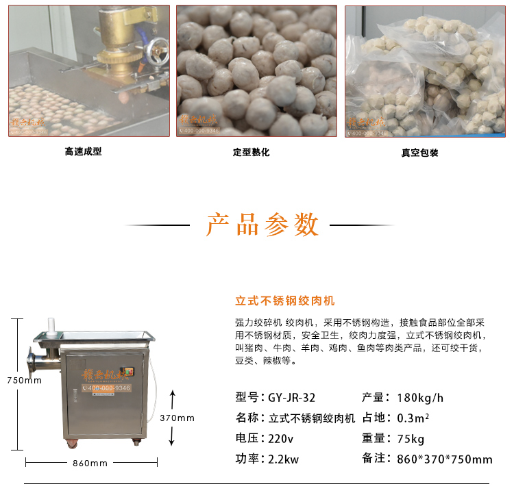 帶真空包裝新鮮豬肉丸,帶魚刺感魚丸生產(chǎn)成套設(shè)備,本套設(shè)備采用32立式不銹鋼絞肉機(jī)、28型全封閉高速肉丸打漿機(jī)、160型加高肉丸成型機(jī)、1500型智能溫控雙加熱水槽和4201型單室真空包裝機(jī)組合而成,可生產(chǎn)新鮮豬肉丸、實(shí)心魚丸、素丸子等小產(chǎn)量加工成型
