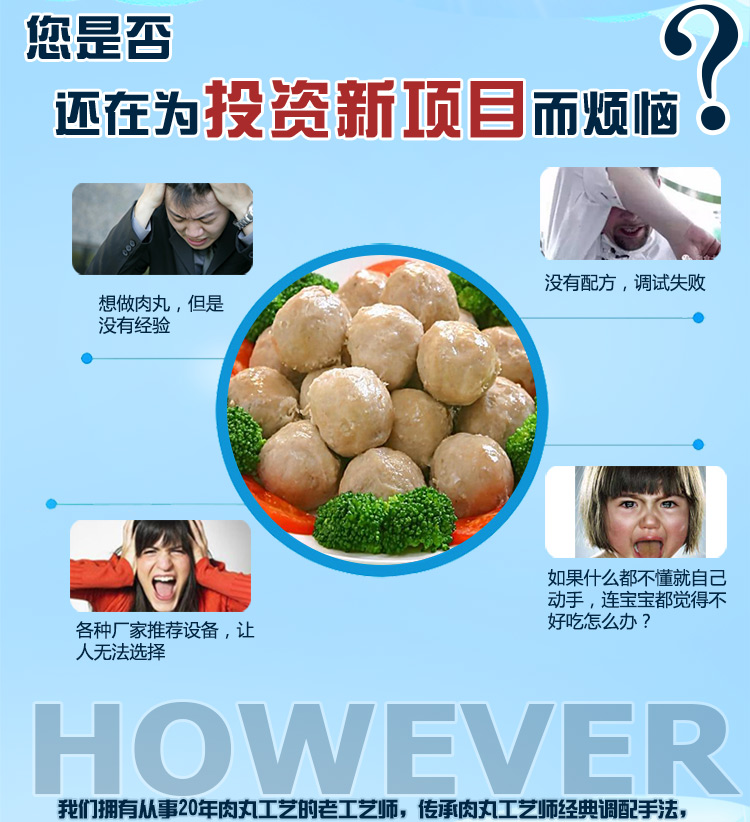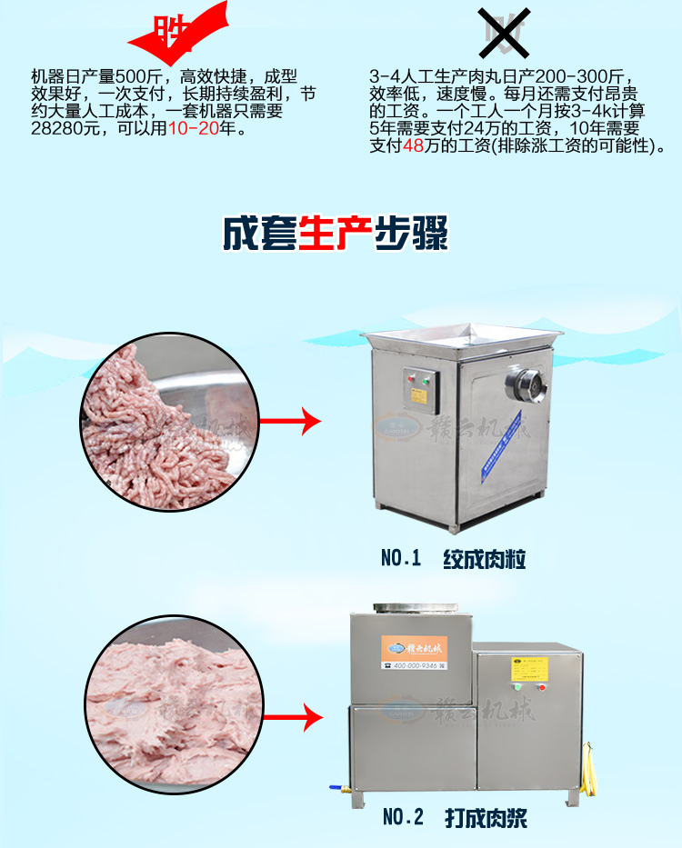 該套設(shè)備是生產(chǎn)500斤實(shí)心肉丸成套設(shè)備,一次性成本,持續(xù)收益,低門檻,高收益。3-4人人工生產(chǎn)肉丸,日產(chǎn)量200-300斤,效率低,速度慢。每月還需要支付昂貴的工資。而機(jī)器的日產(chǎn)量500斤,成型效果好,節(jié)約人工成本,一套機(jī)器可以用大概10年-20年。