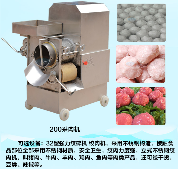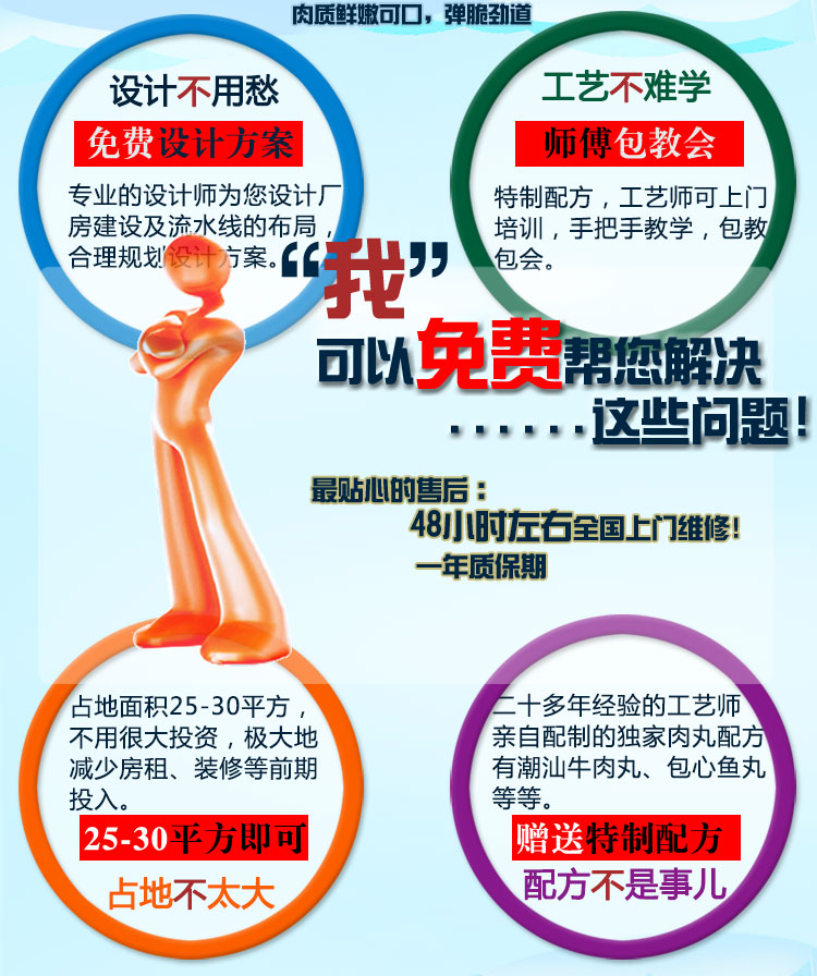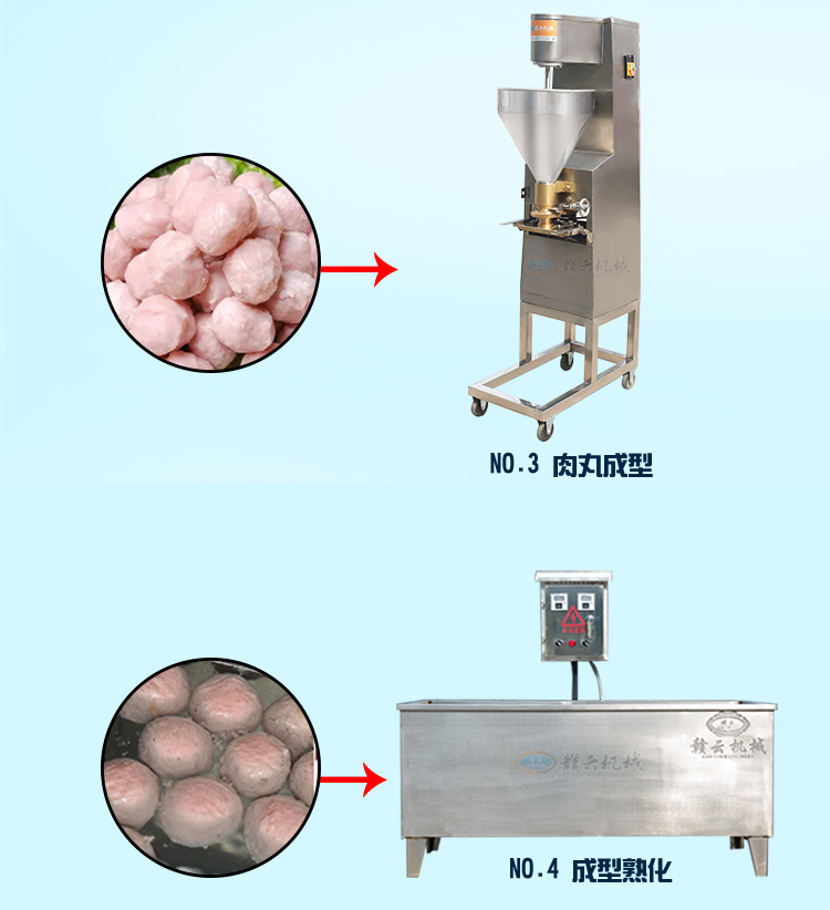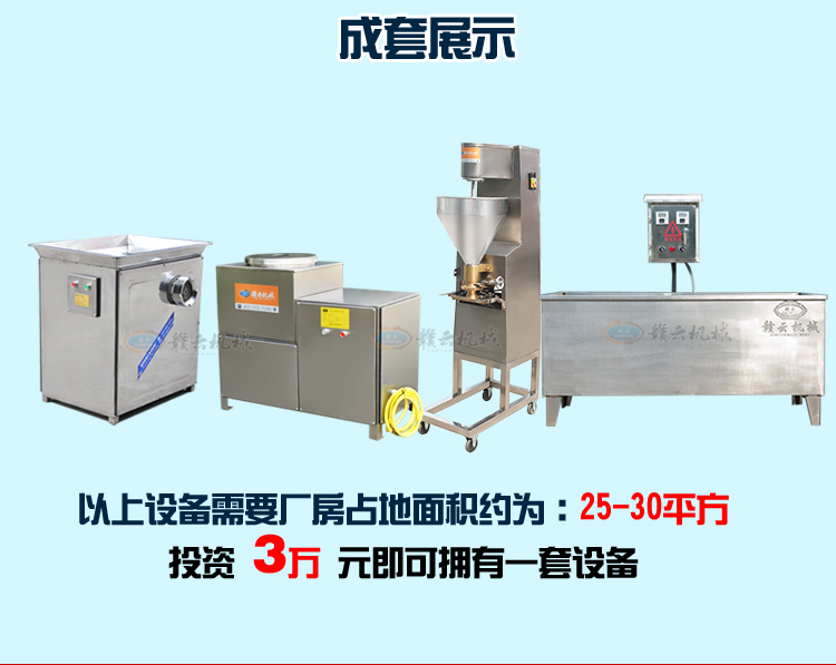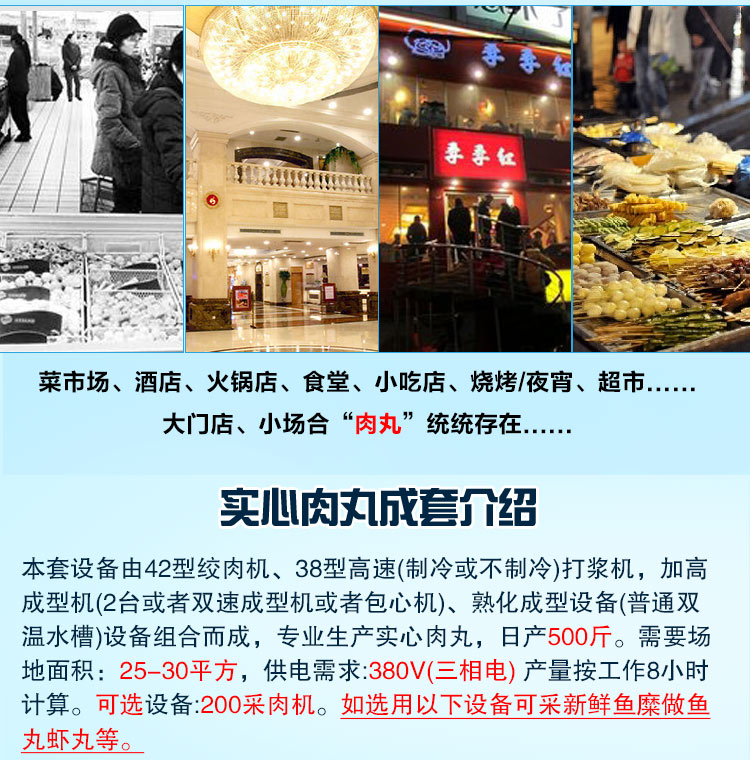 本套設(shè)備由42型絞肉機(jī),38型高速(制冷或不制冷)打漿機(jī),加高肉丸成型機(jī)(2臺或者雙速成型機(jī)或者包心肉丸機(jī))、熟化成型設(shè)備(普通雙溫水槽)設(shè)備組合而成,專業(yè)生產(chǎn)實(shí)心肉丸,日產(chǎn)500斤。需要場地面積:25-30平方,供電需求:380v(三相電)產(chǎn)量按工作8小時(shí)計(jì)算??蛇x設(shè)備:200型采肉機(jī)。如選用一下設(shè)備可采新鮮魚糜做魚丸蝦丸等。