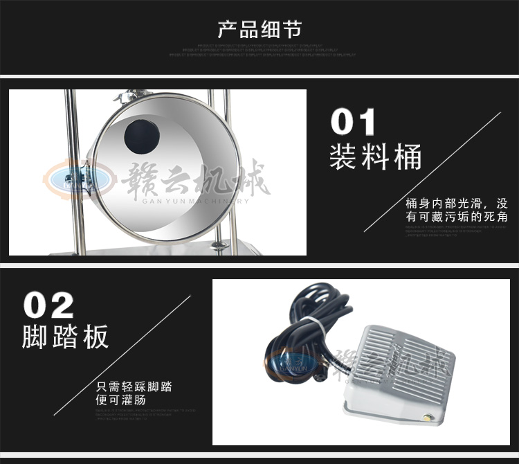 冬季灌腸新添專業(yè)灌腸設(shè)備,贛云牌立式不銹鋼電動(dòng)灌腸機(jī),專業(yè)灌制各種腸類,如臘腸、香腸、火腿腸、親親腸。變頻速度可調(diào),灌腸讓你隨心所欲,整機(jī)采用全齒輪優(yōu)質(zhì)拉桿升降系統(tǒng)設(shè)計(jì).腳踏開關(guān)隨意控制,配合自動(dòng)升降系統(tǒng)及變速可調(diào),灌腸速度快,效果好。