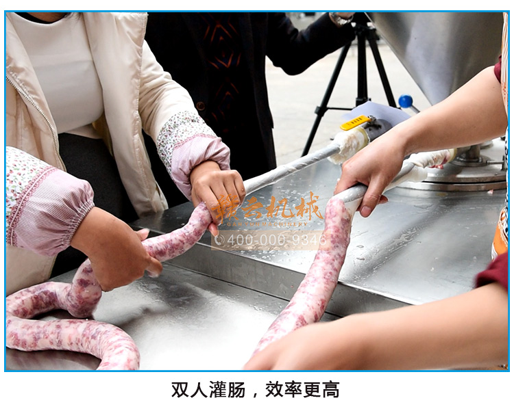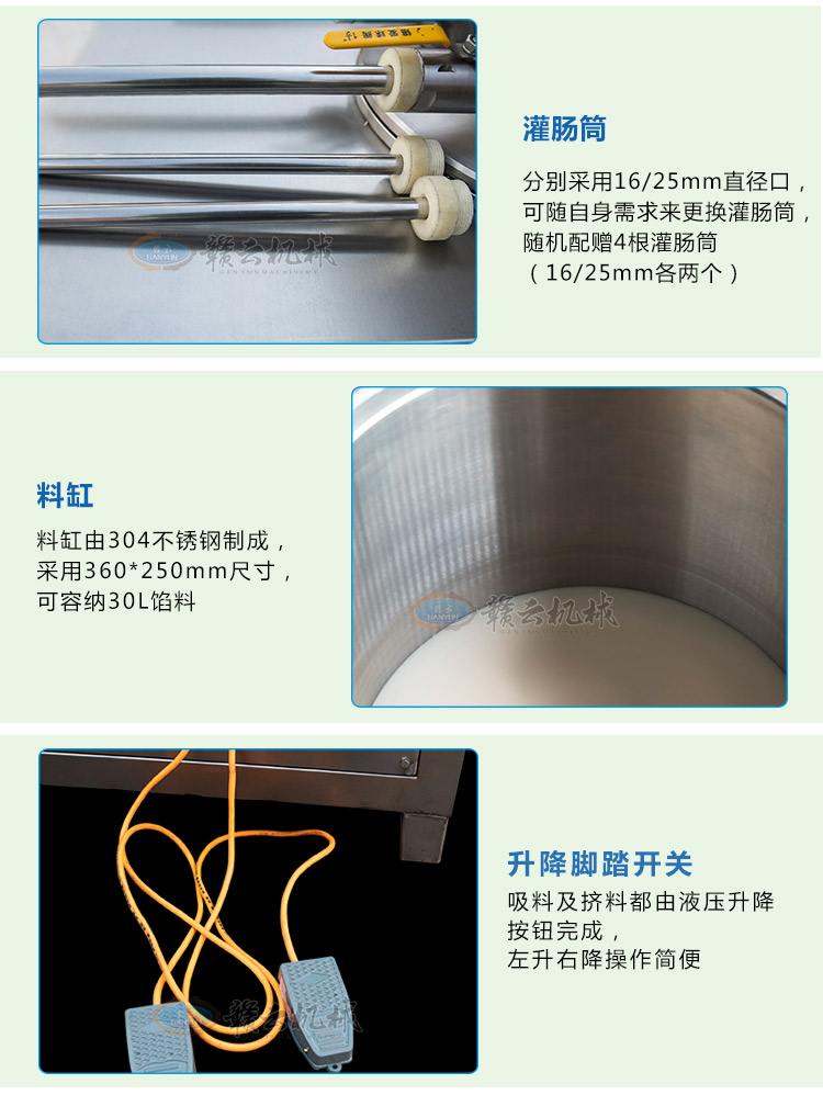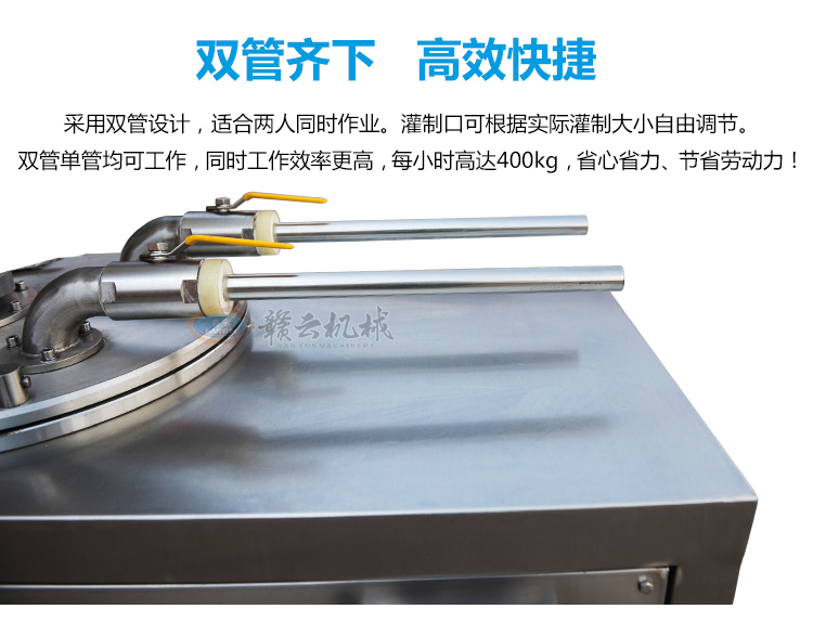 贛云液壓灌腸機(jī),新款灌漿機(jī),雙管灌腸機(jī)采用液壓灌漿推料原理設(shè)計(jì),密封性能良好,配合雙管灌漿,可自動(dòng)調(diào)節(jié)灌漿,自動(dòng)吸料,腳踏開關(guān)控制操縱自如。是腸類灌腸設(shè)備。
