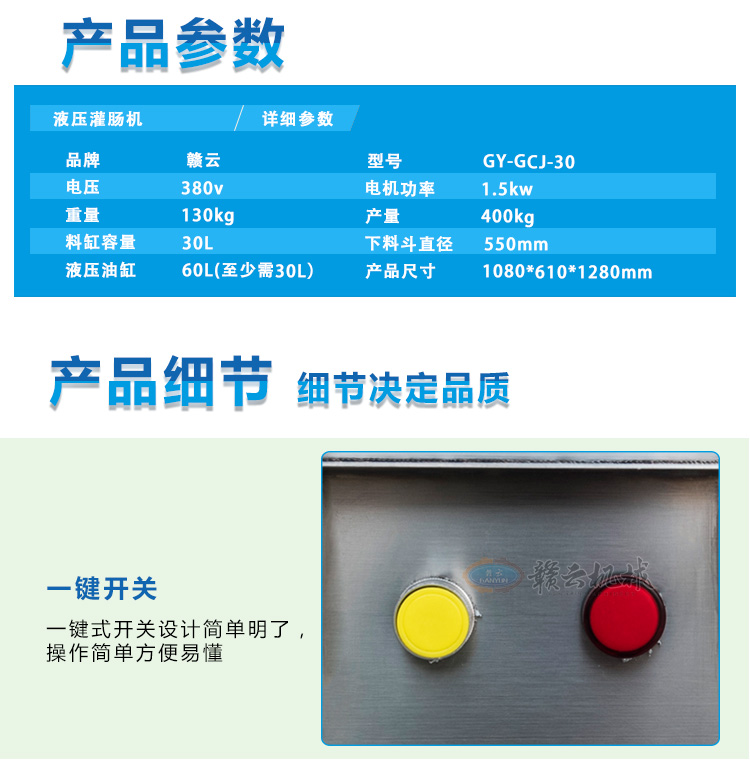 贛云食品機(jī)械旗下液壓灌腸機(jī),新款灌漿制腸,此款雙管灌腸機(jī)采用液壓灌漿推料原理設(shè)計(jì),設(shè)備密封性能良好,配合雙管灌漿提高灌腸產(chǎn)量,設(shè)備可自動(dòng)調(diào)節(jié)灌漿,自動(dòng)吸料,腳踏開關(guān)控制讓人操縱自如。是一款實(shí)用的灌漿制腸設(shè)備。 注意事項(xiàng):首次使用前必須加入一桶16KG的46#液壓油