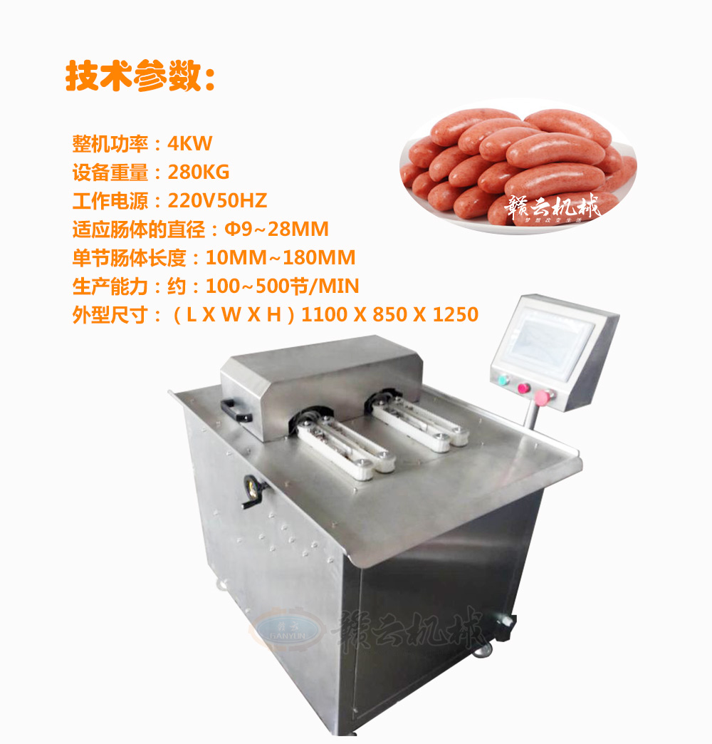 全自動雙路高速香腸扎線機(jī),自動分份,自動繞線,全程自動化控制。該機(jī)采用了優(yōu)質(zhì)電機(jī)和本公司自主研發(fā)的控制系統(tǒng),機(jī)身全不銹鋼制造、效率高、易操控、節(jié)約生產(chǎn)原料等優(yōu)點,產(chǎn)品長度的調(diào)節(jié)可以隨心所欲