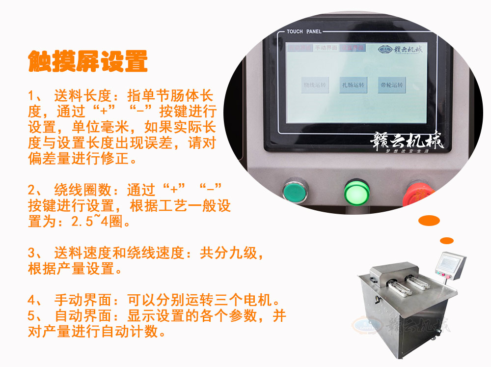 該香腸扎線機(jī)機(jī)械的優(yōu)點是節(jié)約腸衣,并且線扎的產(chǎn)品不用人工和機(jī)械剪節(jié),相對扭結(jié)可節(jié)約人工3人以上和對剪節(jié)設(shè)備的投入;相對半自動扎線機(jī)可節(jié)約10人的費用,切免除工人的體力勞動之苦。該扎線機(jī)操控十分簡單,由于采用人機(jī)對話的液晶屏,設(shè)定長度和速度后,便可以讓機(jī)械自動高效完成所有工作。