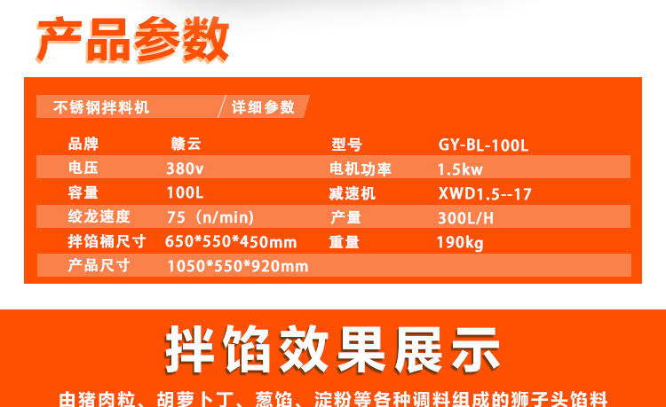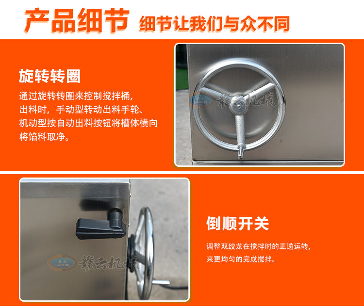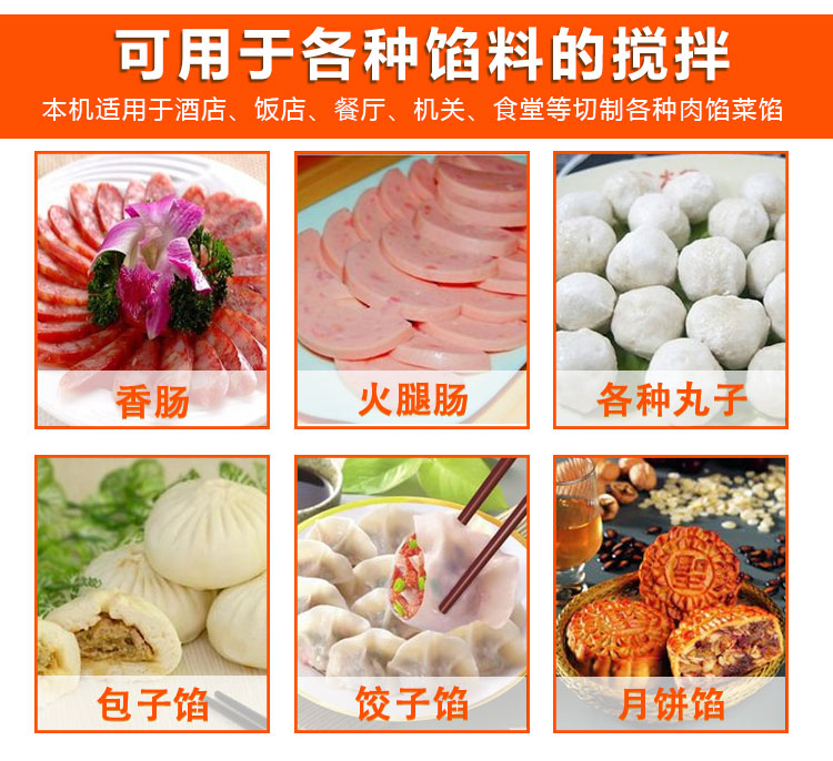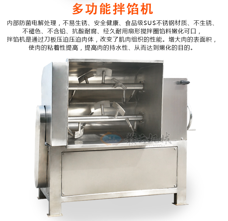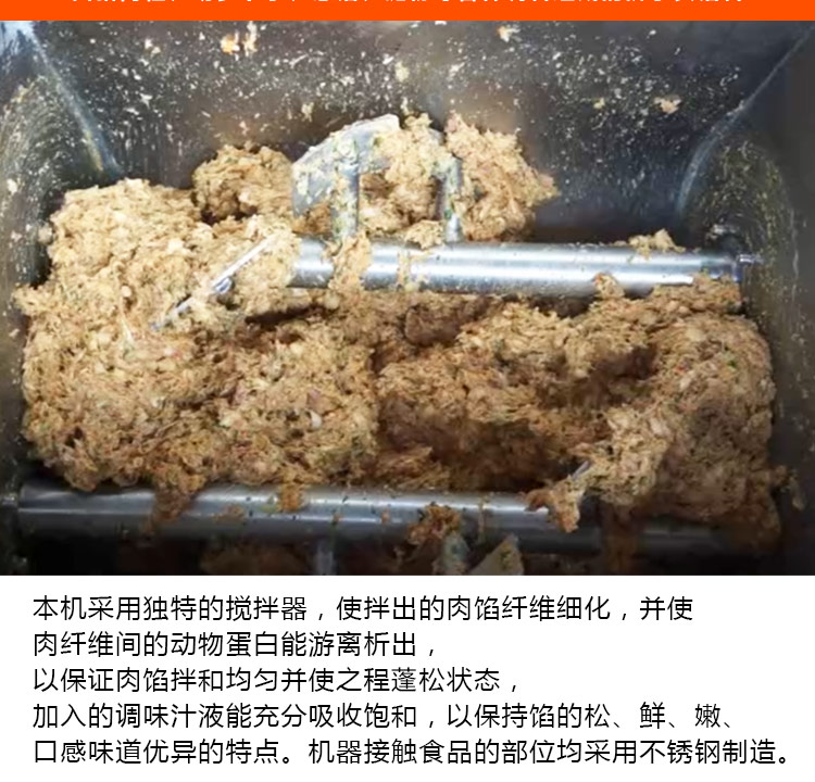 本機(jī)采用304不銹鋼材質(zhì)設(shè)計(jì),符合食品衛(wèi)生加工需求,絞龍型攪拌鋼軸可向內(nèi)向外雙向攪拌旋轉(zhuǎn)運(yùn)動(dòng),由倒順開關(guān)控制攪拌方向,適合粘稠度較大物料的攪拌,攪拌過程還對肉質(zhì)起嫩化效果,是肉餡、肉醬、菜餡等攪拌的上好設(shè)備。