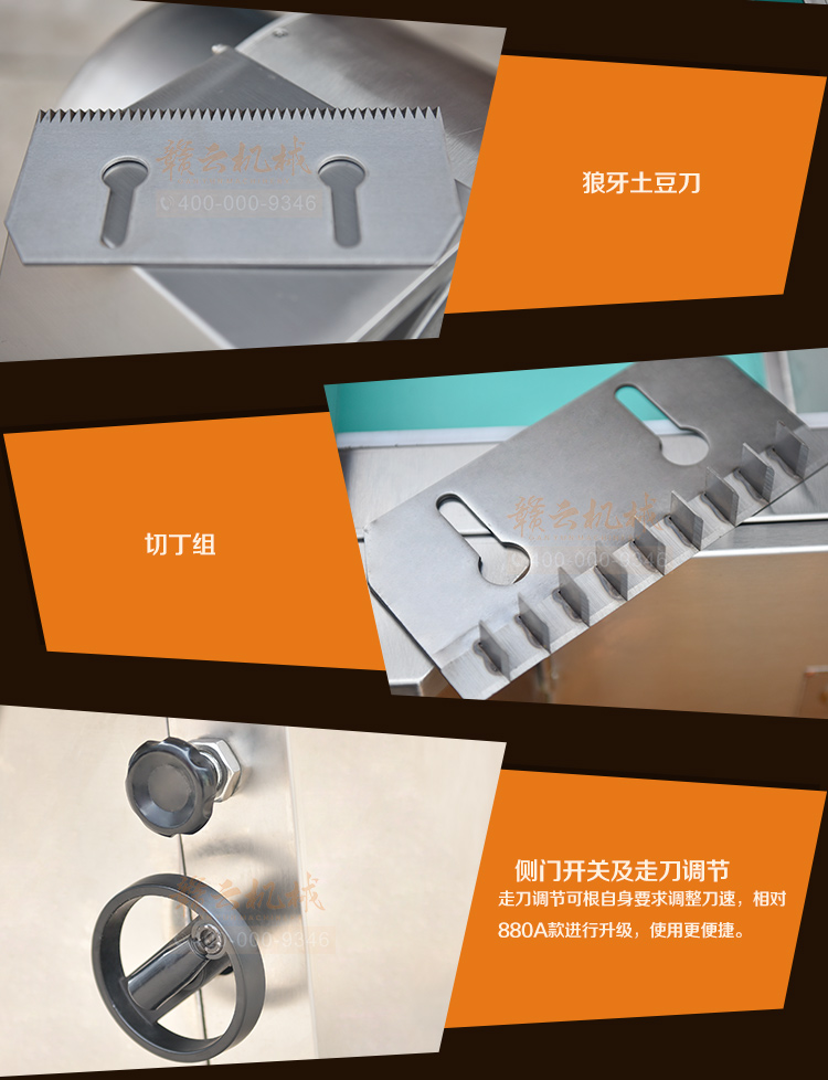 贛云880B型切菜機,采用標(biāo)準(zhǔn)不銹鋼板材加工設(shè)計,做工精細,外形美觀大方,利用齒輪偏心設(shè)計手動旋鈕便攜可調(diào)走刀量,在原880A型切菜機基礎(chǔ)上改良設(shè)計而成,解決多功能切菜機手動走刀量調(diào)節(jié)問題,是食堂,企業(yè)單位、酒店廚房多樣切菜設(shè)備。