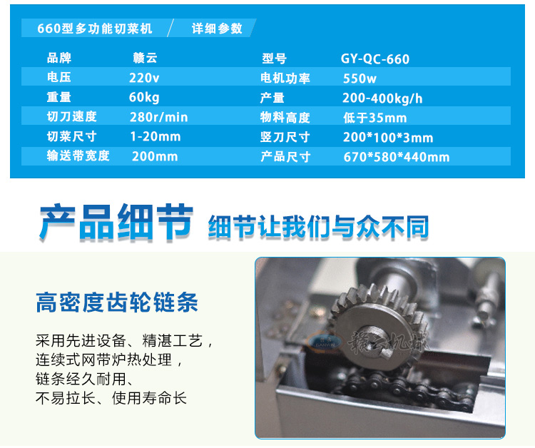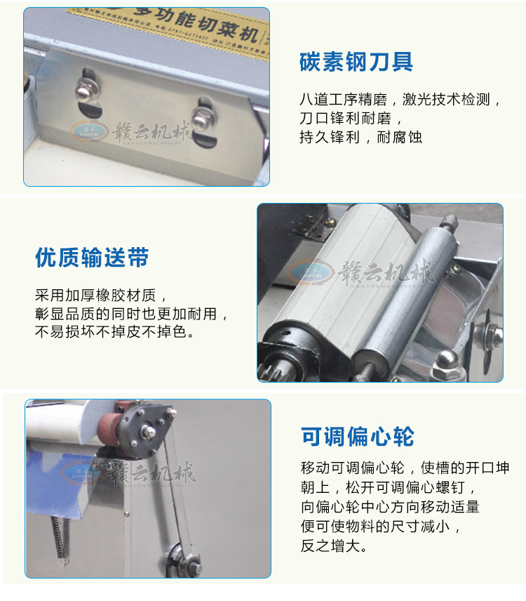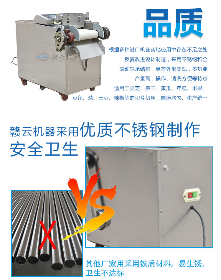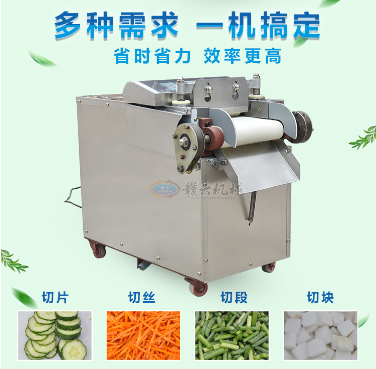 贛云牌多功能切菜機(jī)是根據(jù)多種樣機(jī)在實(shí)地使用中存在不足之處,反復(fù)改進(jìn)設(shè)計(jì)制造,采用不銹鋼和全滾動(dòng)軸承結(jié)構(gòu),具有外形美觀,成熟可靠,使用維修方便等特點(diǎn)。適用直蔬菜脫水、速凍、保鮮、腌漬等食品行業(yè)各類蔬菜。刀片距離可調(diào)節(jié)在0.1cm-2cm之間即切片、丁、絲厚薄在0.1cm-2cm。