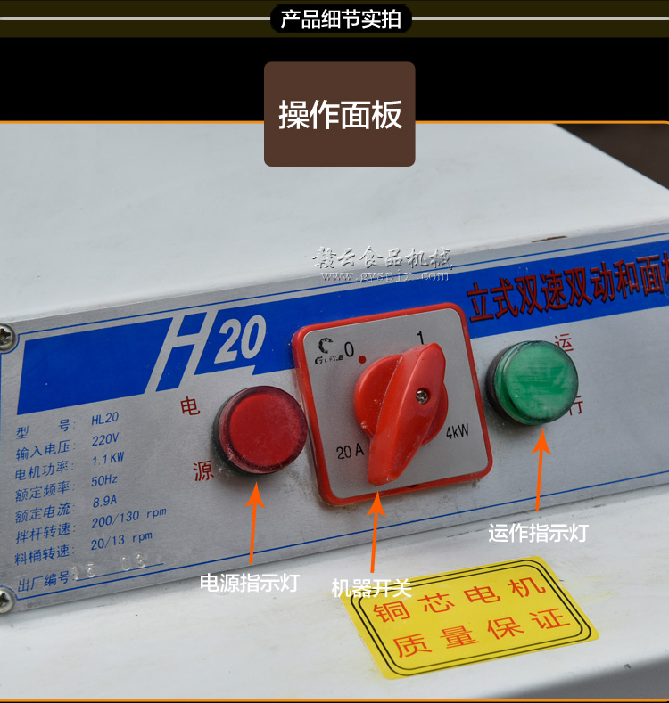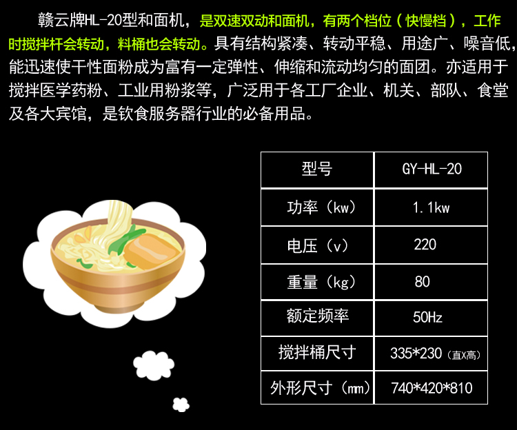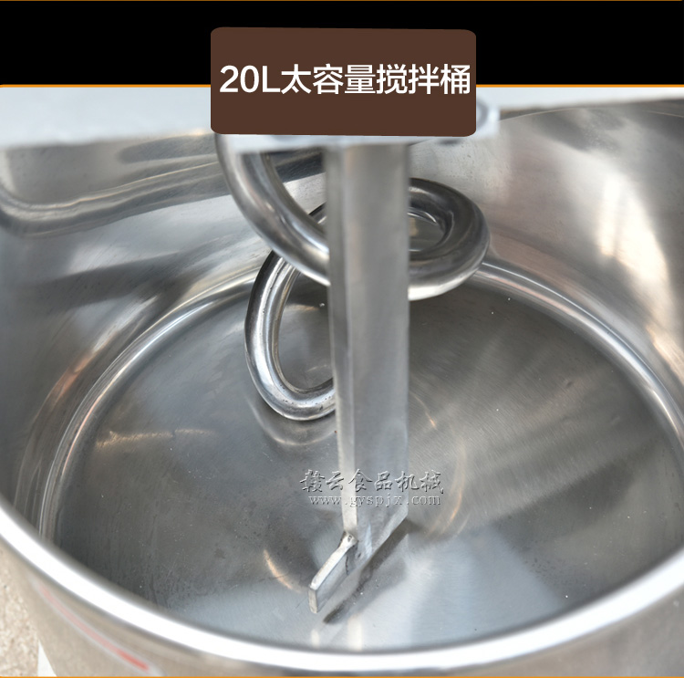 贛云牌HL-20型和面機,立式雙速雙動型和面攪拌機,有兩個檔位(快慢檔),工作時攪拌桿會轉(zhuǎn)動,料桶也跟隨轉(zhuǎn)動。具有結(jié)構(gòu)緊湊、轉(zhuǎn)動平穩(wěn)、用途廣、噪音低,能迅速使干性面粉成為富有一定彈性、伸縮和流動均勻的面團。亦適用于攪拌醫(yī)學藥粉、工業(yè)用粉漿等,廣泛用于各工廠企業(yè)、機關(guān)、部隊、食堂及各大賓館,是飲食服務(wù)器行業(yè)的常見用品。我廠常規(guī)批量生產(chǎn)供應的雙速雙動和面攪拌機有20L和30L兩種型號,如需更大規(guī)格可定做,如60L、80L,歡迎來電咨詢:電話0797-8373422