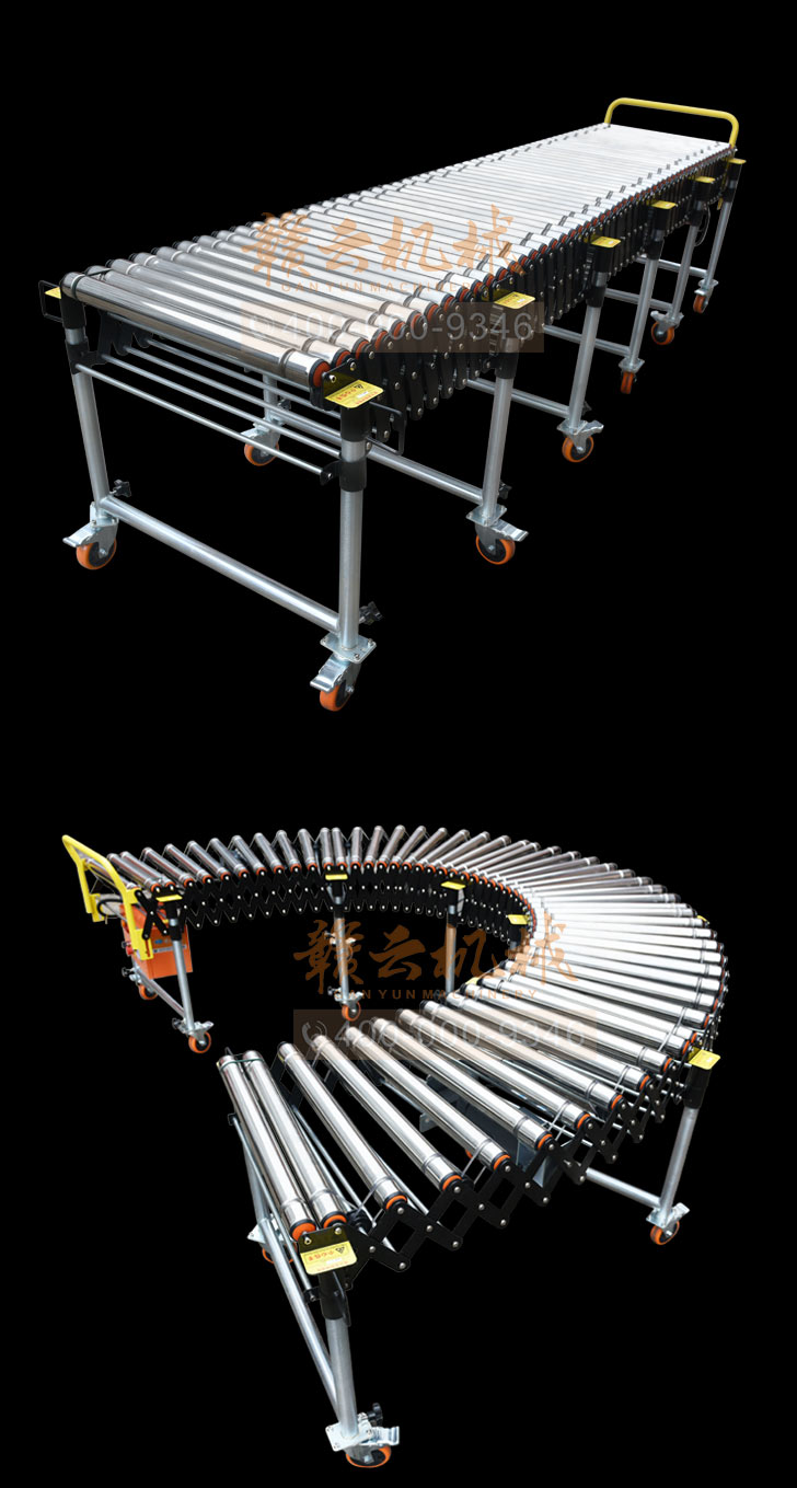 伸縮型輥筒輸送機是利用可伸縮的組件做機架的輸送機,機體可自由變向,改變?nèi)我饨嵌?,支腿高度可以調(diào)節(jié),下部設(shè)有腳輪可以移動,并可按需要形成直段和圓弧段,適用于需要靈活布置的移動式無動力輸送機,腳輪可帶剎車,伸長長度可限位