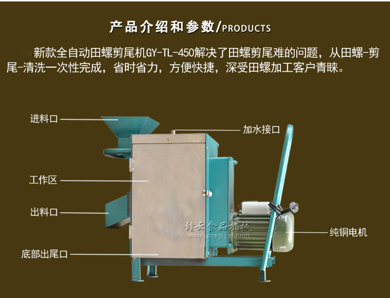 新款全自動(dòng)田螺剪尾機(jī)GY-TL-450解決了田螺剪尾難的問(wèn)題,從田螺-剪尾-清洗一次性完成,省時(shí)省力,方便快捷,深受田螺加工客戶青睞。
