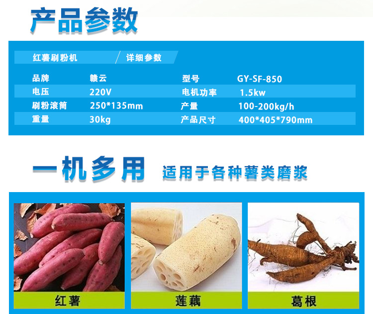 紅薯刷粉機(jī)適用于加工番薯/紅薯、木薯、馬鈴薯、蕉藕、芋頭及其它塊根作物的磨碎作業(yè),加工成粉。適用于山區(qū)、半山區(qū)的糧食加工廠及普通用戶??膳溆?20V的1.5KW電機(jī)使用,也可配用柴油機(jī),目前價(jià)格配的是國(guó)標(biāo)銅線電機(jī)!