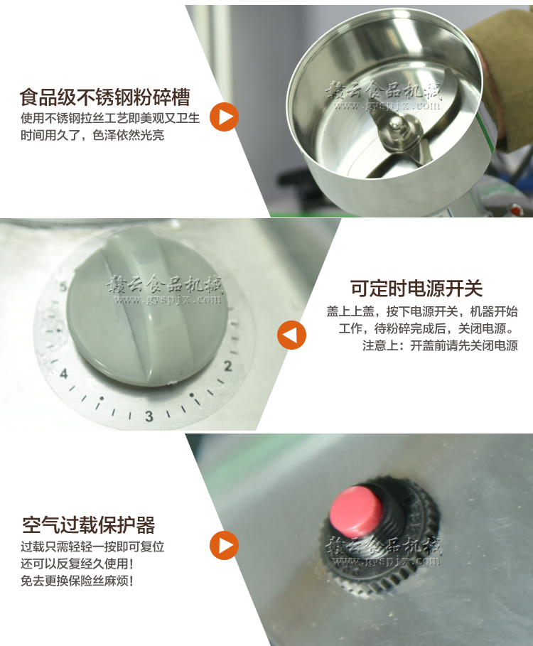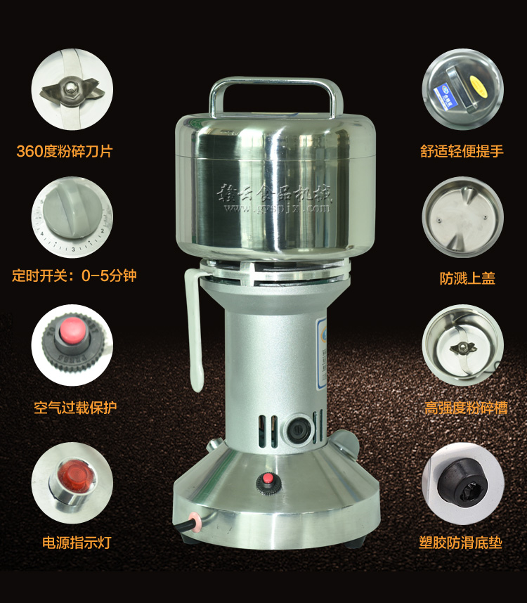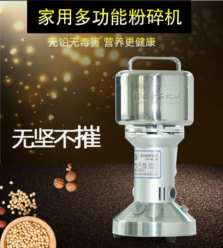 贛云系列多功能粉碎機采用純銅高速電機帶動粉碎刀片將物料快速打成粉末,可用于粉碎五谷、雜糧、田七、阿膠、白叁等,一般粉碎時間1-2分鐘即可,新款粉碎機改保險絲為空氣過載保護器,使用更安全,我廠提供的粉碎機有100克-2500克不同型號的多功能粉碎機。