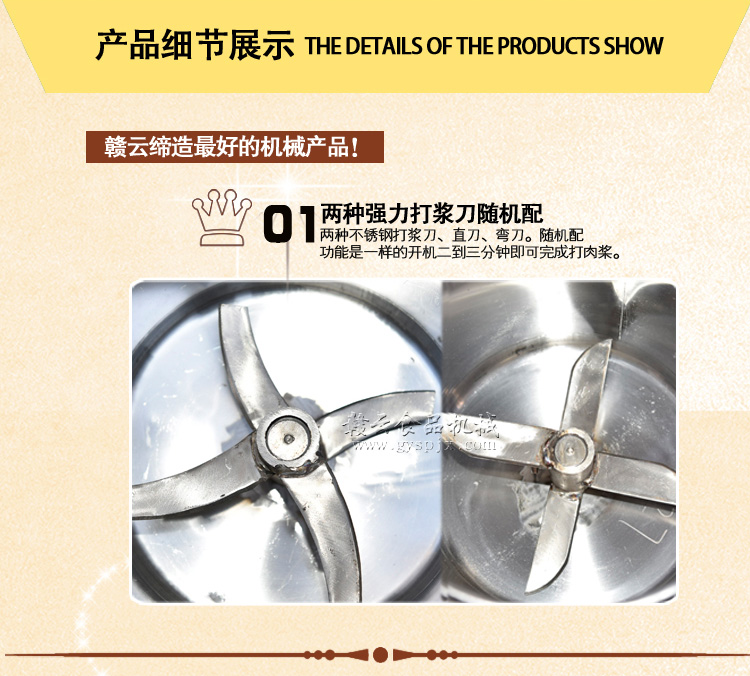 贛云牌全不銹鋼傳動高速肉丸打漿機,整機采用優(yōu)質(zhì)不銹鋼材質(zhì),拉伸桶底部弧形設(shè)計,贛云新款肉丸打漿機標(biāo)志性設(shè)計。無縫焊接技術(shù)展現(xiàn)高檔品質(zhì)。一次性可打肉漿4-5斤,2分鐘左右即可完成肉漿的制作。所打肉漿細(xì)膩,是肉丸專用打漿設(shè)備之一。