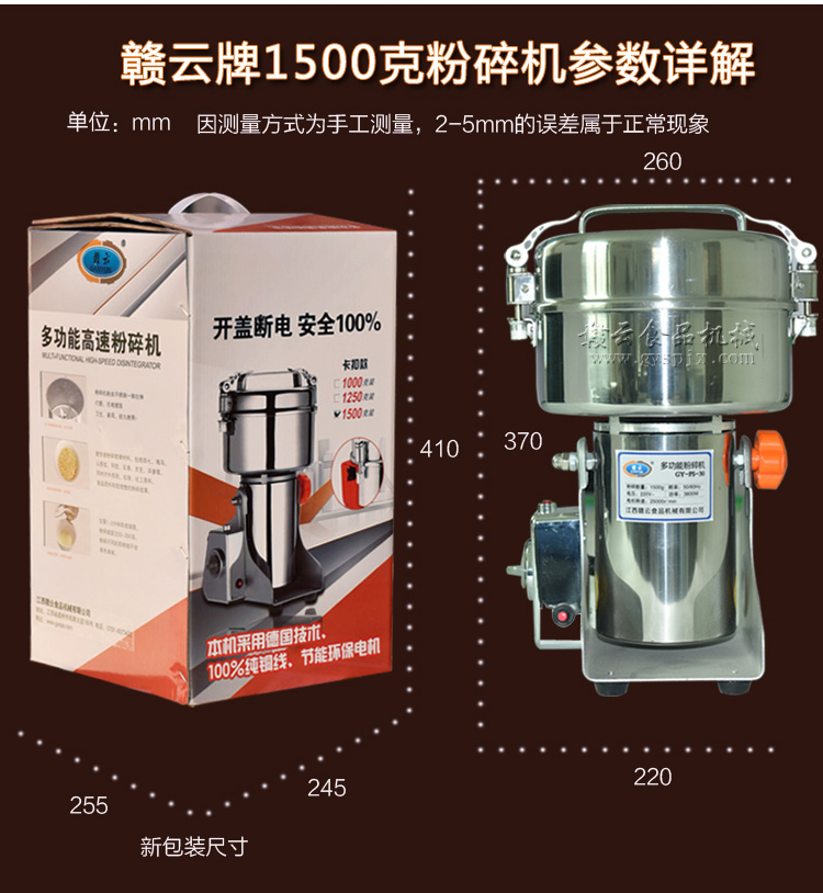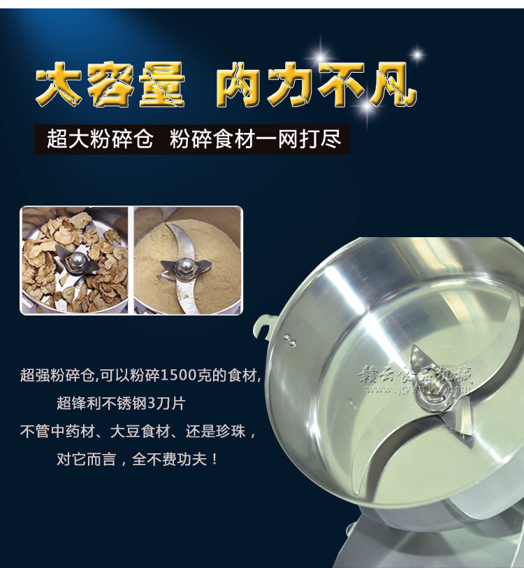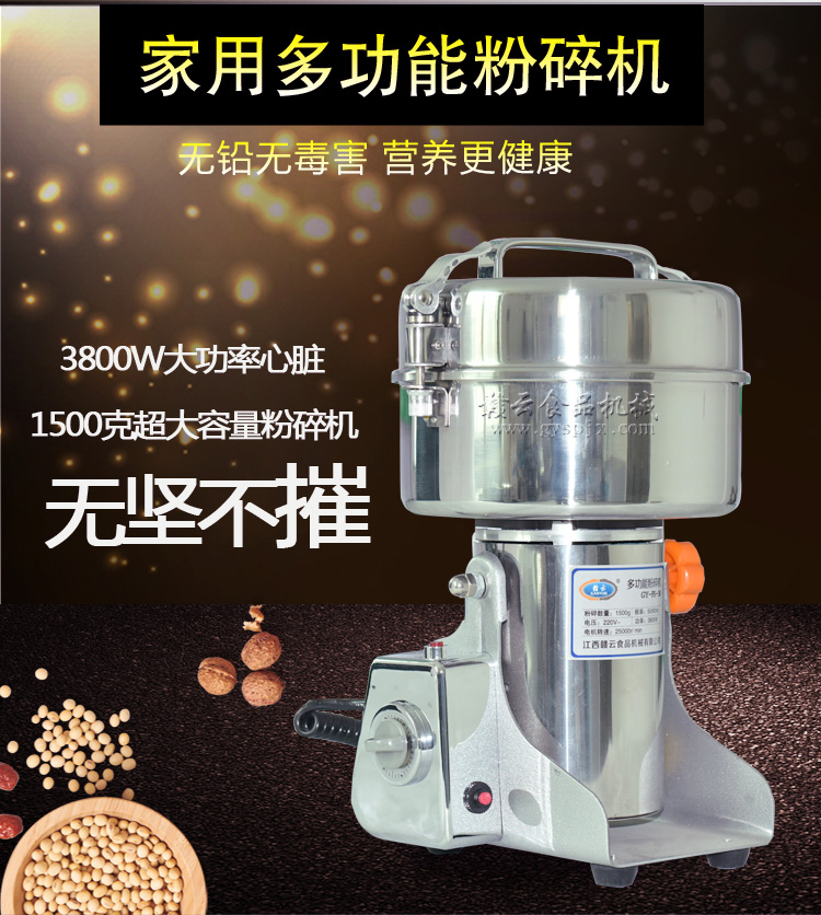 贛云系列多功能粉碎機(jī)采用純銅高速電機(jī)帶動(dòng)粉碎刀片將物料快速打成粉末,可用于粉碎五谷、雜糧、田七、阿膠、白叁等,一般粉碎時(shí)間1-2分鐘即可,新款粉碎機(jī)改保險(xiǎn)絲為空氣過載保護(hù)器,使用更安全,我廠提供的粉碎機(jī)有100克-1000克不同型號(hào)的多功能粉碎機(jī)。