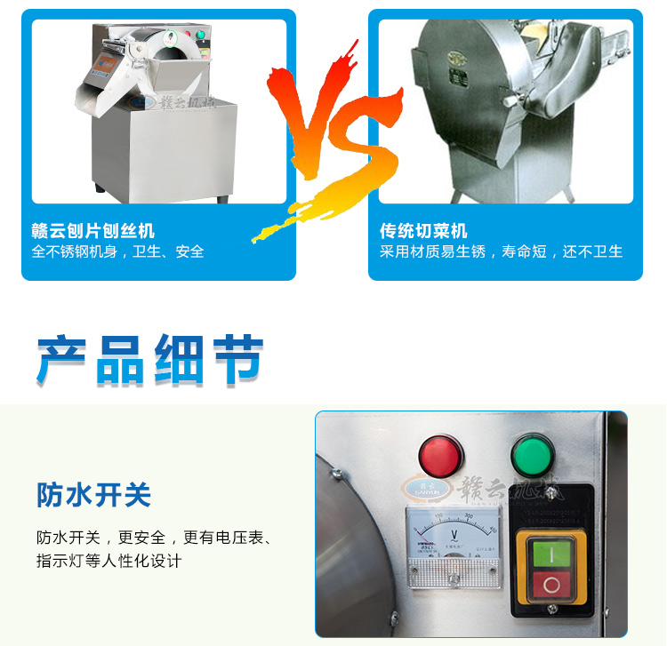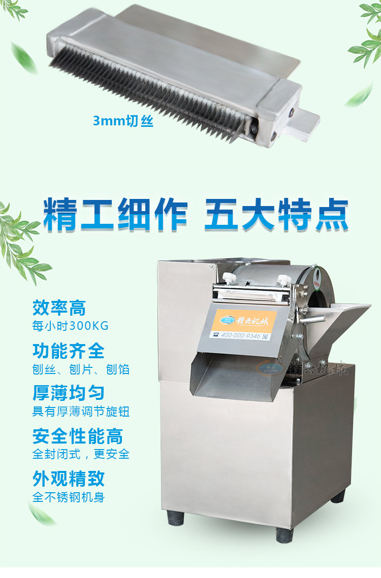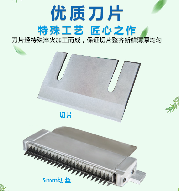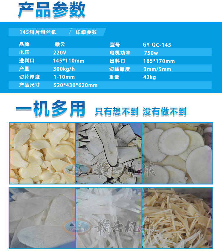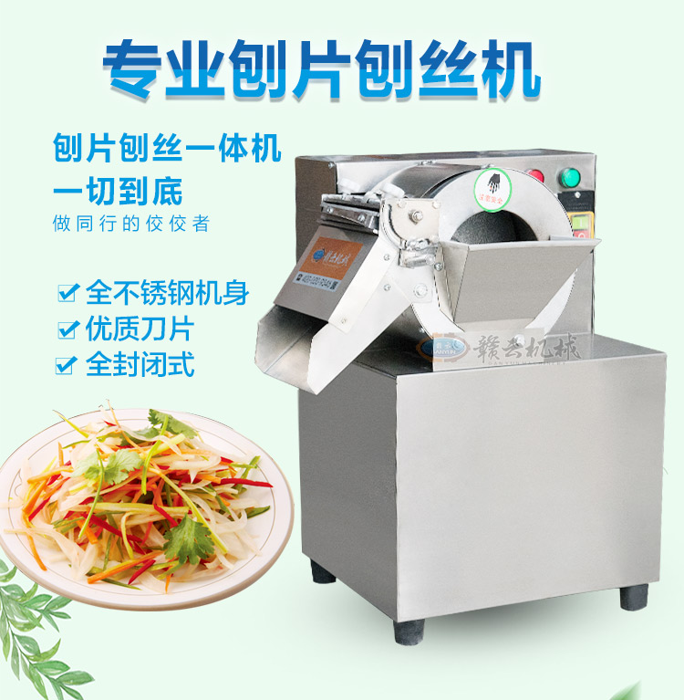 贛云牌145型刨片刨絲機(jī),可用于土豆、蘿卜、胡蘿卜、茄子、黃瓜等刨片或刨絲,還能切顆粒,整機(jī)外殼采用不銹鋼材質(zhì),小巧精致,刨片厚度可調(diào)范圍1-10mm,配有固定切絲刀3mm和5mm規(guī)格。特別適用于學(xué)校食堂,果蔬加工廠,礦場、部隊(duì)等大型食堂加工之用。