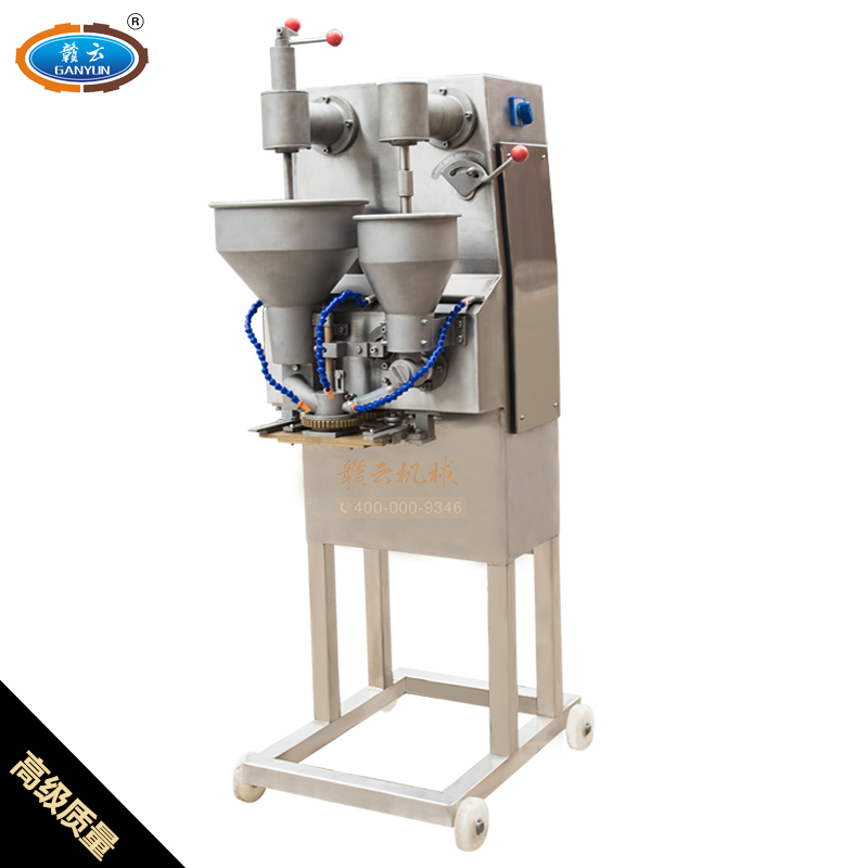 第三代包心肉丸機是在贛云二代包心肉丸機的基礎上,對二代包心機的成型切割部位進行優(yōu)化提速處理,達到每分鐘200粒的成型速度是二代包心機的兩倍,且推料控制方式還是選用一級絞龍推料和二次泵定量輸送相結合的原理,餡料控制改塑料螺蓋為不銹鋼抗氧化特殊處理螺蓋,餡斗新增絞龍擋板,可有效防止肉餡余留餡斗,更易肉餡的向下擠壓輸送作用,成型旋轉齒輪上新增潤滑滴管,彌補了二代包心機成型區(qū)域局部潤滑切刀的缺陷,做出的包心包餡丸表皮光滑,個體圓且大,成型速度快,無小尾巴等優(yōu)勢。綜上優(yōu)勢pk二代和目前其他廠家新款式包心肉丸機,故稱之為贛云第三代包心肉丸機!