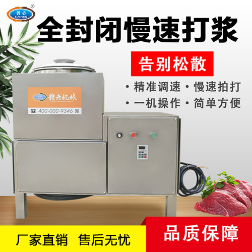 贛云牌36型全封閉式慢速變頻肉丸打漿機選優(yōu)質(zhì)不銹鋼,在全不銹鋼慢速肉丸打漿機基礎(chǔ)上將整機外殼用不銹鋼板材封裝,更好的保護電動機,通過小皮帶輪帶動大皮帶輪減速,慢速拍打肉漿。