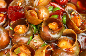 4、洗凈炒鍋,旺火燒熱,下油,倒入田螺,然后將精鹽用清水?dāng)噭,淋入鍋?nèi)炒勻,加蓋約3 分鐘,放豆豉、蒜、紫蘇茸透炒一次,再加蓋約3分鐘,再炒,直至透熟。