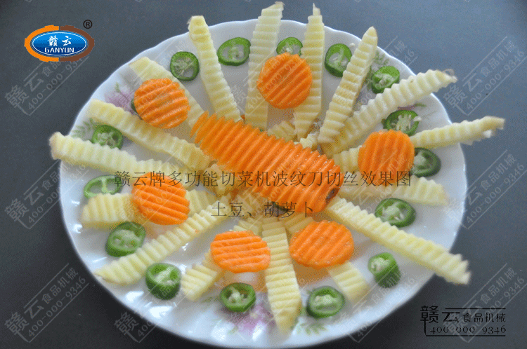 贛云牌多功能切菜機安裝波紋型刀具切出波浪形效果。以胡蘿卜和土豆為例,經(jīng)過離心切片后切波浪型效果展示圖: