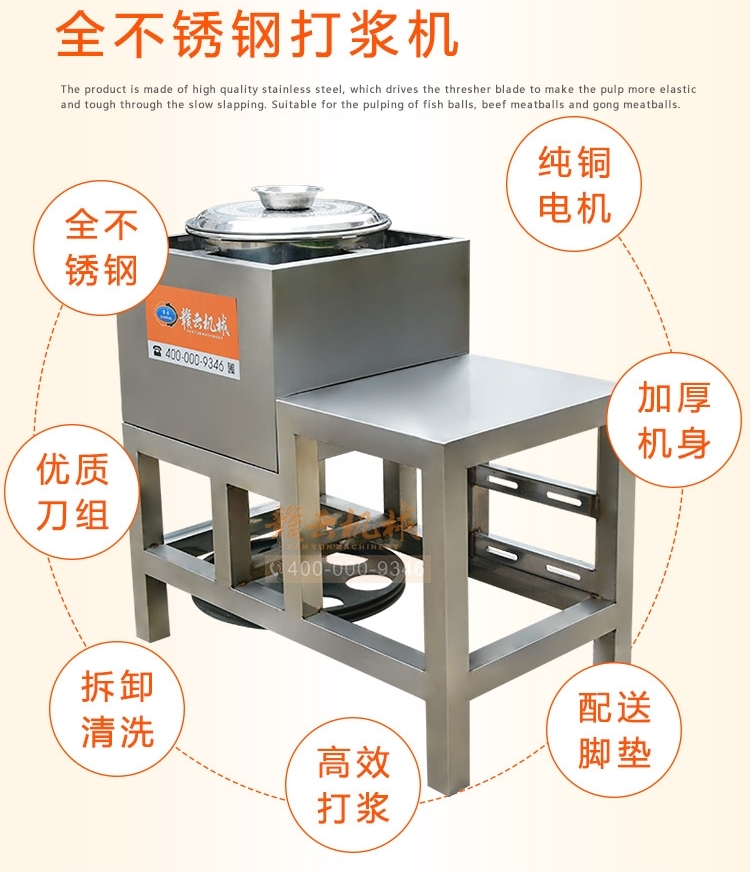 這臺(tái)慢速打漿機(jī)通過大皮帶輪減速帶動(dòng)打漿機(jī)刀片打漿,這樣通過慢速拍打,可以使拍打過程中能對肉類組織細(xì)胞拉絲重組,加大吸收水分,提高肉類的嫩化程度,讓打出來的肉漿制成丸子后更軟彈有嚼勁。適合魚丸、牛肉丸和貢丸的制漿之用。