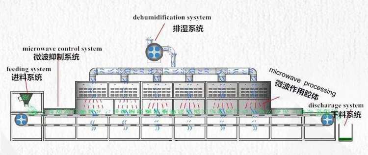 2.微波烘干區(qū)域:烘干區(qū)域是一個位于隧道中間區(qū)域,待烘干的物體通過輸送帶進烘干室內進行快速烘干。烘干室通常排濕系統(tǒng)和輸送系統(tǒng),周邊由金屬材料構成,以防止微波輻射泄露出去。