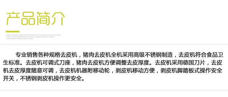 扒皮機(jī)全機(jī)采用高級不銹鋼,符合國家食品衛(wèi)生標(biāo)準(zhǔn)?烧{(diào)式刀座,方便調(diào)整去皮厚度。采用優(yōu)質(zhì)刀片,馬力十足,清洗方便,無需拆卸簡單操作,輕松清洗,操作桿靈活自由變動(dòng),機(jī)器附移動(dòng)輪,撥皮更方便,腳踏板式操作安全開關(guān)。不銹鋼撥皮機(jī)操作更安全,機(jī)器小巧靈便。