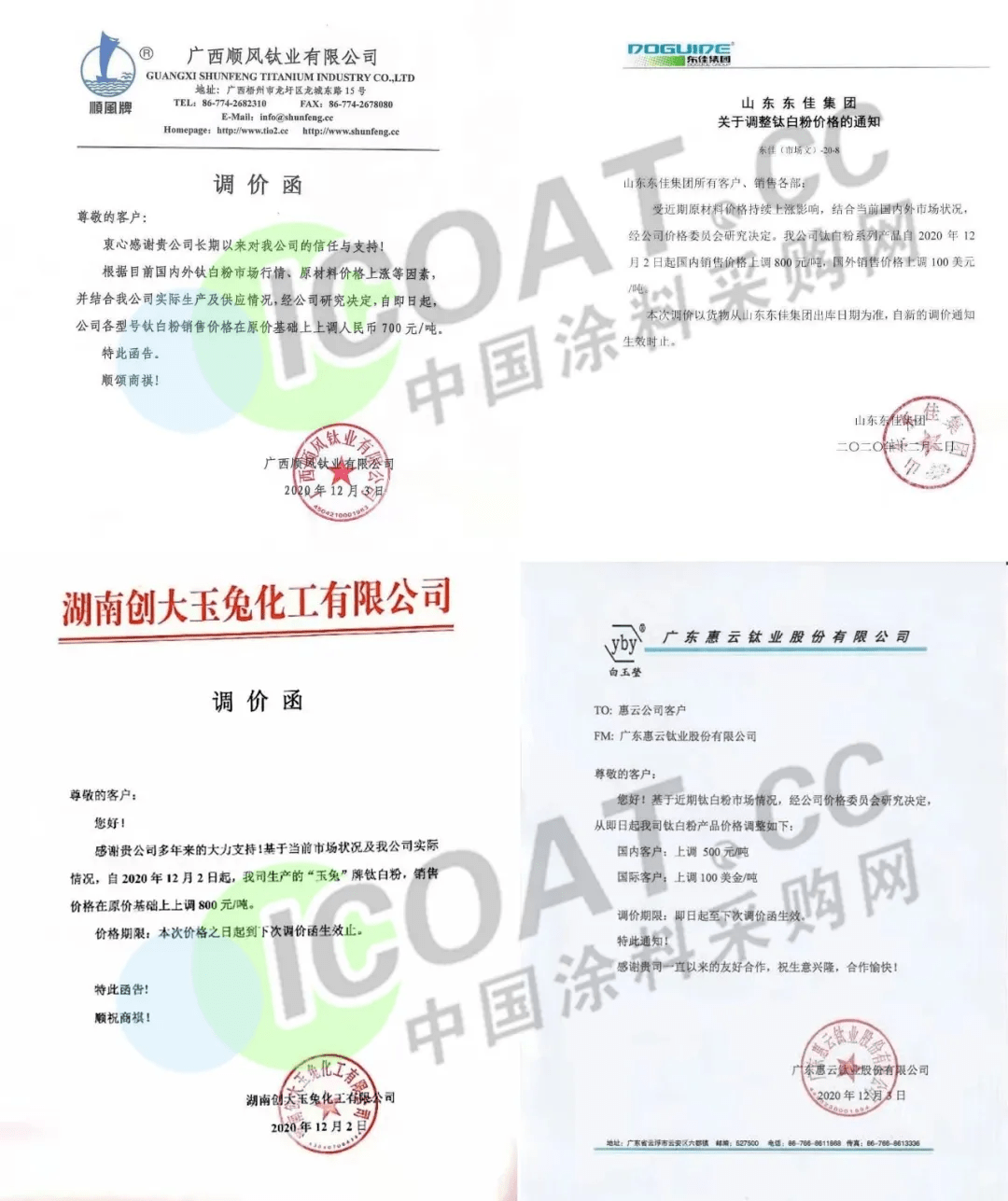 2020年12月1日起,鈦白市場再次掀起新一波漲價潮。據(jù)不完全統(tǒng)計,目前已有近20家主流鈦白廠商發(fā)布漲價通知,其中包括龍蟒佰利聯(lián)、攀鋼、海峰鑫、山東道恩、廣西順風等。此次調(diào)價鈦白企業(yè)調(diào)價幅度多為700-1000元,且已經(jīng)開啟了全年第8輪調(diào)價,累計調(diào)漲最高5300元/噸。